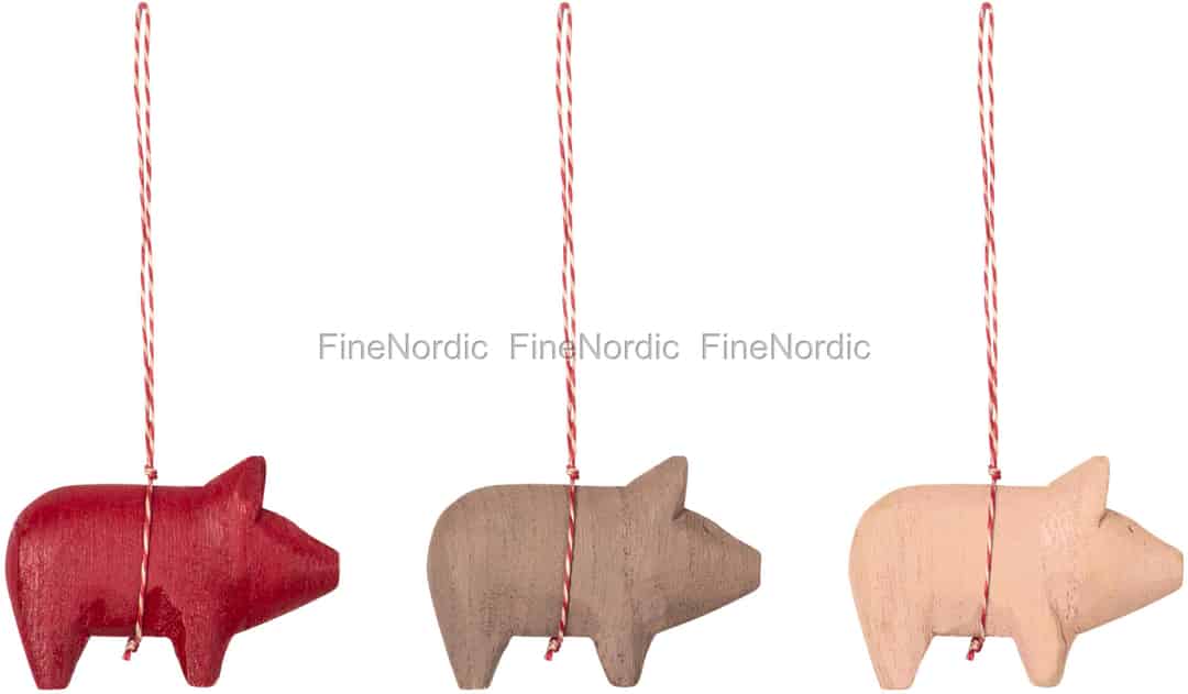 Sind Sie auch ein Fan von den entzückenden Maileg Schweinchen? Dann ist dieses kleine dreiteilige Schweinchen Set aus Holz genau das Richtige für Sie. Jedes Schwein hat eine andere Farbe und an jedem ist eine rot-weiß gestreifte Schnur angebracht, sodass Sie sie ganz leicht aufhängen können. Die Schweine sind jeweils 4,5 cm hoch und 6 cm lang. Sie können alle drei Schweine zusammen aufhängen oder aber getrennt an verschiedenen Stellen in Haus anbringen. Hängen Sie sie an Ihren Weihnachtsbaum, einige Tannenzweige oder an einen Haken und genießen Sie ihr charmantes Aussehen. Sie sind auch attraktive Bonusgeschenke auf einem hübsch verpackten Geschenk oder ein nettes Präsent für die Gastgeberin. Dekorieren Sie Ihr eigenes Zuhause mit diesen süßen Schweinchen oder verschenken Sie sie an einen Schweine Liebhaber.