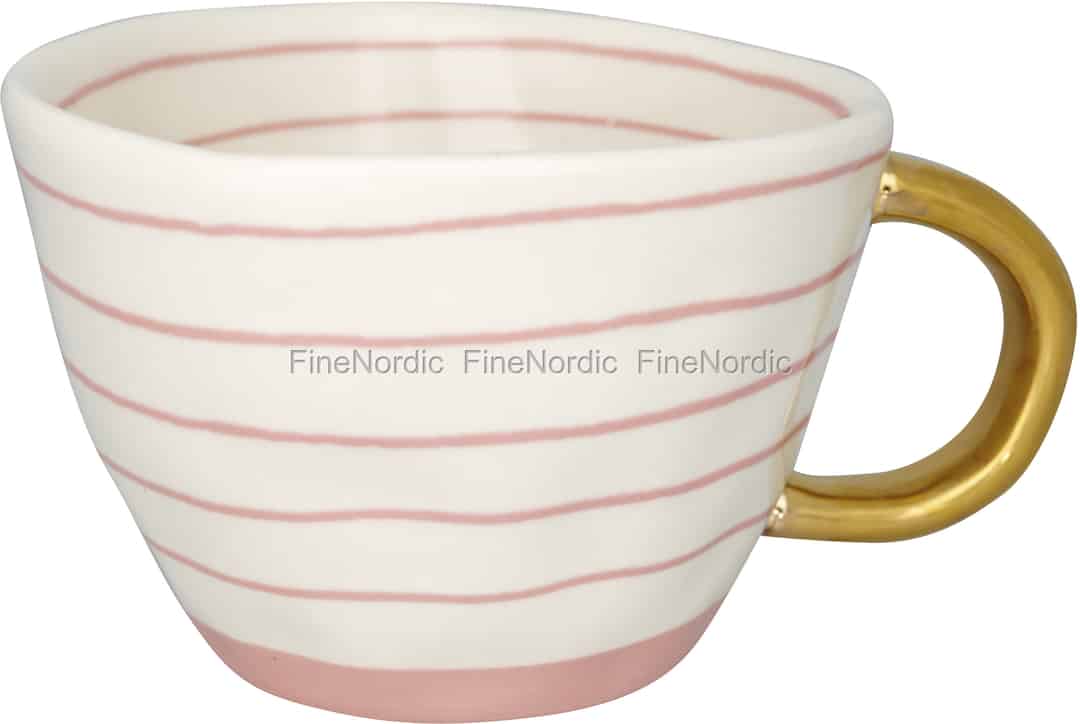 Die Sally Pale Pink Tasse von GreenGate ist mit zarten hellrosa Linien bemalt. Sie ist von Hand bemalt und daher sehen keine zwei Tassen genau gleich aus. Die Tasse ist durch ihren reichlich großen goldfarbenen Henkel gut zu halten und auch zu tragen. Kombinieren Sie sie mit den anderen Sally Pale Pink Produkten von GreenGate und genießen Sie das hübsche Aussehen des wunderschön gedeckten Tisches. Aufgrund des goldenen Dekors empfehlen wir Ihnen, dieses Produkt von Hand zu waschen.