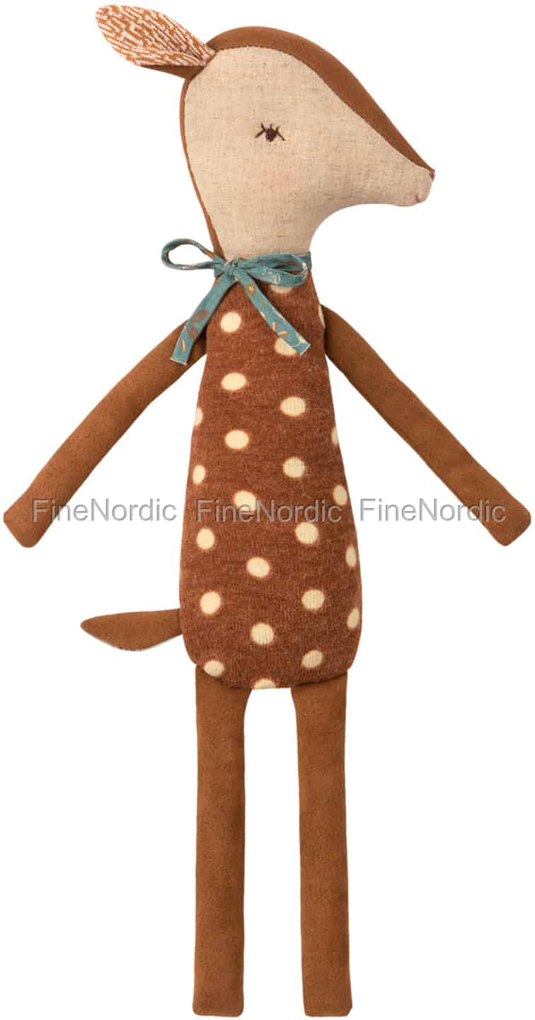 Der Maileg Sleepy / Wakey Bambi Medium ist ein niedlicher kleiner Freund zum Kuscheln, zum Spielen und zum gemeinsamen Nickerchen halten. Der 40 cm große Bambi ist mit possierlichen Baby Reh Flecken bedeckt. Er hat ein Auge offen und eins geschlossen. Wenn man ihn auf eine Seite legt, dann schläft er und wenn man ihn umdreht, dann ist er wach. Er fährt sehr gerne bei langen Autofahrten mit, und auch zum Zoo oder zum Spielplatz geht er mit Vergnügen. Falls er während der Ausflüge etwas schmutzig wird, kann er bei 30 ° C in der Waschmaschine gewaschen werden und sieht danach aus wie neu. Er ist auch ein guter Zuhörer und möchte alle Ideen, Sorgen und auch Träume hören. Maileg´s Bambi ist ein wunderbarer Spielgefährte für einen kleinen Jungen oder ein kleines Mädchen.