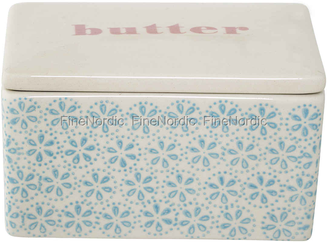 Die wohlgestaltete Butterdose Patrizia Blau von Bloomingville passt nicht nur gut auf die Butter auf, sie schaut auch wunderschön aus. Die Porzellan Dose mit blauem Blumenmuster stellen wir gerne und stolz auf den Esstisch. Auf dem Deckel steht in rosa Schrift:“butter“ und so kommen erst gar keine Zweifel auf, was denn in der Dose versteckt sein könnte. Die Butterdose kann sehr gut mit anderem Geschirr der Patrizia kombiniert werden und zusammen mit einfarbigem hellblauen oder rosafarbenen Geschirr sorgt sie für einen schönen Kontrast auf dem Tisch. Nach Benutz kann sie einfach in der Spülmaschine gewaschen werden und schon ist sie für den nächsten Einsatz bereit. Gut ausschauen und praktisch sein, so haben wir’s gerne!