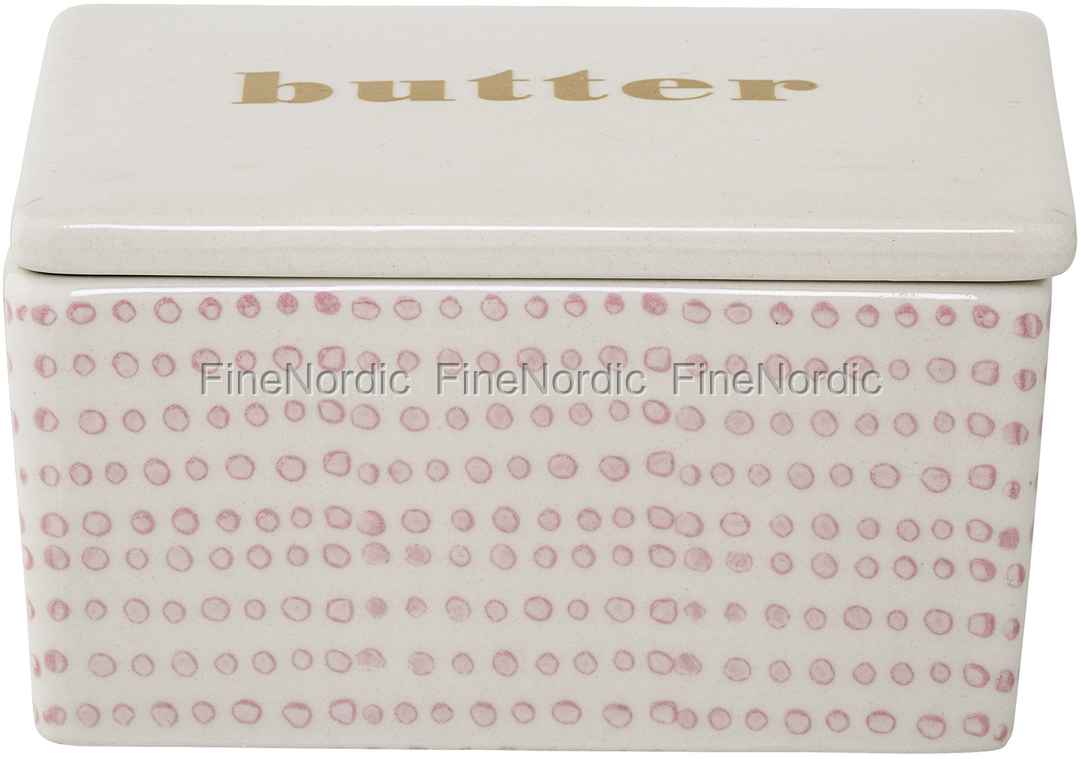 Sind Sie Rosa Fan? Dann wird Ihnen die Susie Butterdose von Bloomingville bestimmt gut gefallen. Fröhliche rosa Punkte auf den Seiten der Dose erwecken unsere Aufmerksamkeit. Dank des Schriftzugs „butter“ auf dem Deckel ist auch gleich geklärt, was sich in der Dose versteckt. Die Butterdose ist so hübsch anzusehen, sie darf vom Kühlschrank direkt auf den schön gedeckten Frühstückstisch. Nach Gebrauch ist sie einfach in der Spülmaschine zu waschen und schon ist sie wieder einsatzbereit. Dank Susie, ist alles in Butter!