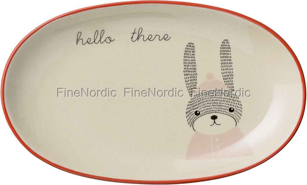 Auf dem Mollie Kaninchen Teller von Bloomingville ist ein entzückender kleiner Hase und die Worte: "hello there" abgebildet. Er hat einen roten Rand und der Keramikteller ist Teil der Mini Serie von Bloomingville. Der ovale Teller misst 21 cm x 12,5 cm und kann als normaler Essteller oder Servierteller verwendet werden. Auf diesem charmanten Teller können Sie Obst, Gemüsesticks, Käsewürfel und mehr servieren. Wenn Ihnen das Aussehen dieses Tellers gefällt, dann sehen Sie sich doch bitte auch die anderen Mollie Geschirrteile an, die wir von Bloomingvilles Mini Kollektion anbieten.