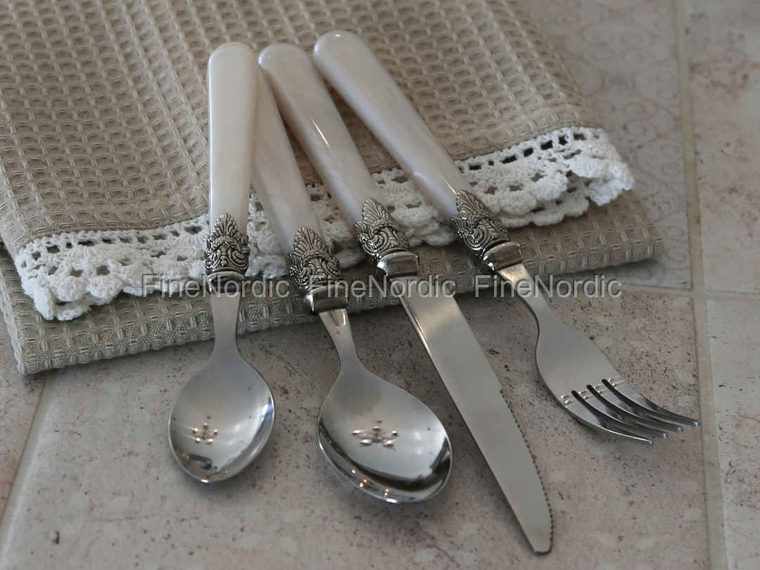Das elegante 16-teilige Besteckset von Chic Antique mit Silber Dekor Antik Perlmutt ist eine Augenweide auf dem Esstisch. Ob beim täglichen Mittagessen oder beim Festtagsessen an Feiertagen, das Besteck kann bei allen Anlässen genutzt werden. Der Edelstahl des Essbestecks steht in schönem Kontrast zu den Griffen in Perlmuttoptik. Das 16-teilige Besteckset von Chic Antique besteht aus je vier Messern, vier Gabeln, vier Löffeln und vier Teelöffeln. Ein stilvolles Besteckset für den Alltag, sowie für feierliche Anlässe ist das Chic Antique Besteckset mit Silber Dekor Antik Perlmutt.