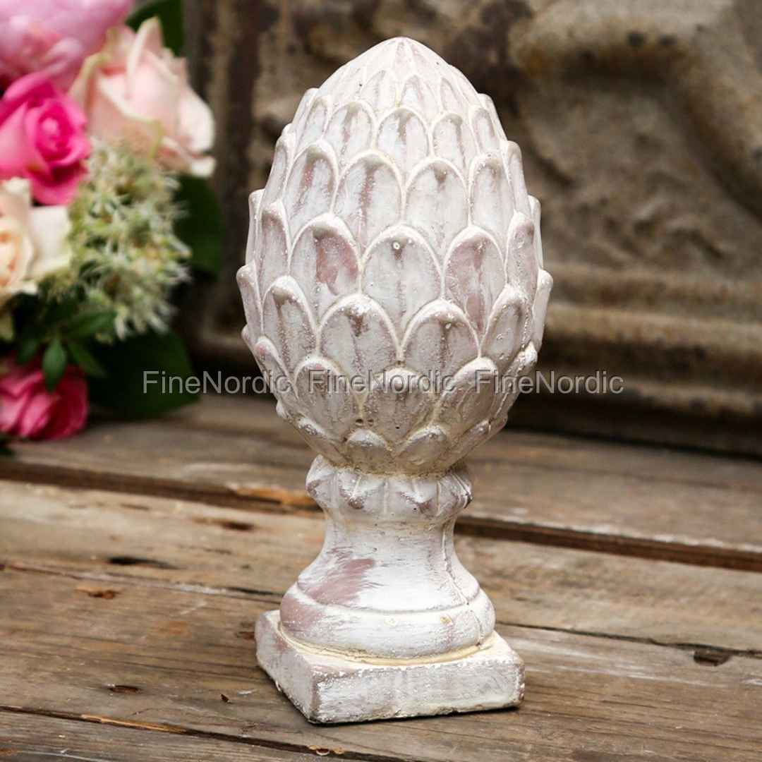 Der Französische Dekor auf Fuß von Chic Antique in Antik Creme erinnert an einen Zapfen. Eine attraktive Dekoration für das Haus, den Garten und die Terrasse. Der französische Dekor ist frostsicher und kann somit gut das ganze Jahr über draußen stehen. Vielleicht als hübsche Begrüßung am Hauseingang oder als interessanter Hingucker in Garten? Der cremefarbene Dekor hat mehrere Stellen, die wie abgekratzt erscheinen und uneben sind, aber diese sind gewollt und tragen zum Charme des Zapfens bei. Der cremefarbene Zapfen ist auch ein stilvolles Gastgeschenk oder ein schönes Dankeschön für die hilfreiche Freundin.