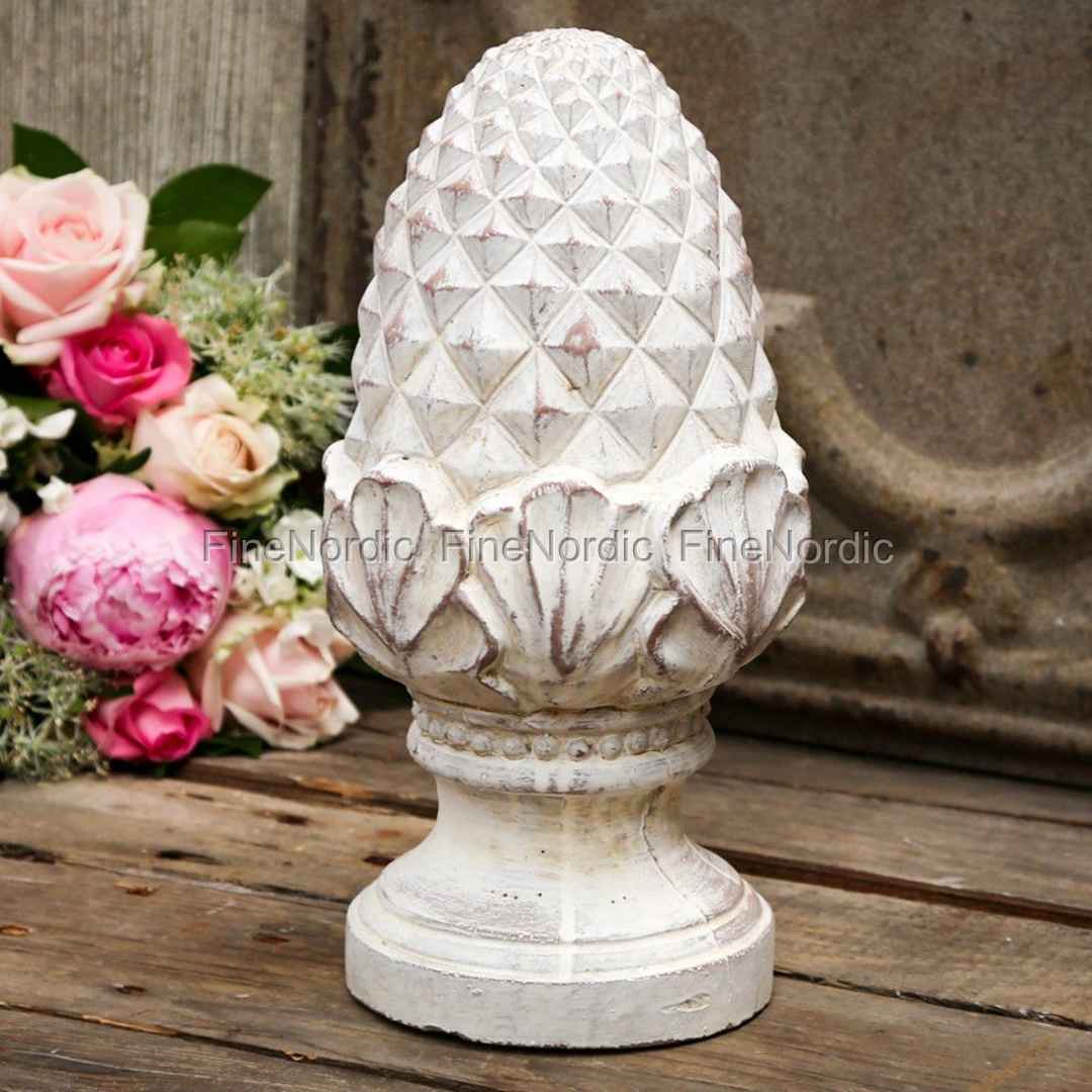 Der französische Dekor auf Fuß von Chic Antique in Antik Creme ist eine tolle Dekoration für den Kaminsims, die Fensterbank oder die Eingangstür. Er erinnert an einen Zapfen oder an ein nostalgisches Symbol, was man in einem Stadtwappen sehen kann. Unebenheiten und kleine Kratzer sind gewollt und tragen zu dem Charme des Dekors bei. Er ist 30 cm hoch und frostsicher, so dass er gerne vor der Haustür, in Garten oder auf der Terrasse stehen darf. Wenn Sie diesen französischen Dekor mögen, dann schauen Sie sich bitte auch die kleinere, und etwas anders aussehende Version an, welche auch in unserem Webshop zu finden ist.
