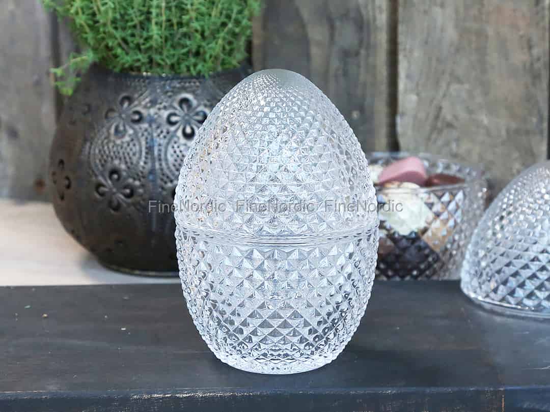 Dieses Glasei von Chic Antique ist eine schöne Dekoration auf einem Tisch, Regal oder Fensterbrett. Wir mögen die gut aussehende Eiform sowie das attraktive Glasmuster. Sie können den Glasdeckel abheben und das Ei mit kleinen Leckereien wie Pralinen oder Süßigkeiten füllen. Stellen Sie das Ei auf Ihren Nachttisch und Sie können Ihre Ringe und Schmuck über Nacht darin aufbewahren. Es ist eine hübsche Deko sowie auch ein praktischer Aufbewahrungsbehälter. Das Chic Antique Glasei ist auch in einer kleineren Version erhältlich.