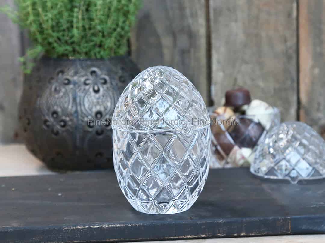 Dekorieren Sie Ihren Tisch oder Ihr Regal mit diesem gut aussehenden Glasei von Chic Antique. Das kleine Glasei hat ein hübsches Muster und der Deckel ist abhebbar, und so kann es ganz leicht mit ein paar Leckereien gefüllt werden. Das Ei bietet einen schönen Kontrast neben anderen Materialien wie Keramikvasen, Holzkerzenhaltern usw. Sie können es alleine oder neben dem größeren Glasei von Chic Antique platzieren, welches wir ebenfalls zur Verfügung haben. Die Chic Antique Glaseier sind eine schöne Dekoration für den Frühling sowie auch Ostern.