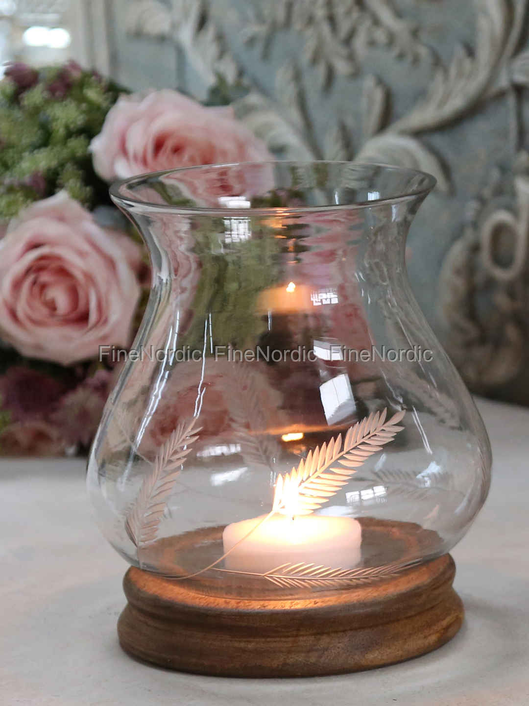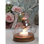 Geschliffenes Windlicht auf Holzsockel H 19 cm, von Chic Antique.