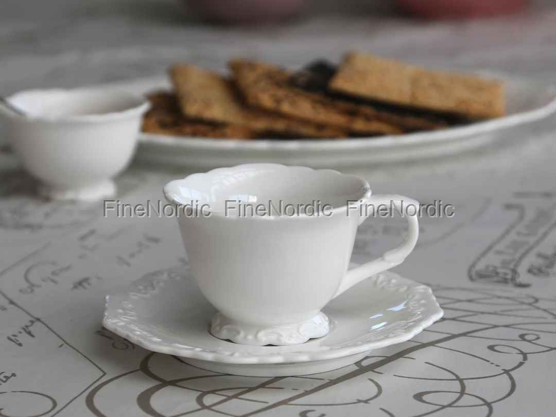 Die Kaffeetasse Provence von Chic Antique gefällt uns sehr. Die schicke Form, die gewellten Kanten und der Unterteller mit den markanten Provence Verschnörkelungen, machen sie zu einem Hingucker auf dem Kaffeetisch. 200 ml Ihres heißen Lieblingsgetränks passen in die Kaffeetasse und nach Gebrauch kann sie in der Spülmaschine gereinigt werden. Dank des großen Henkels lässt sie sich gut halten und auf dem Unterteller findet der Kaffeelöffel oder vielleicht ein Keks Platz. Die Kaffeetasse Provence von Chic Antique ist eine schöne Ergänzung für Ihre Provence Geschirrsammlung.