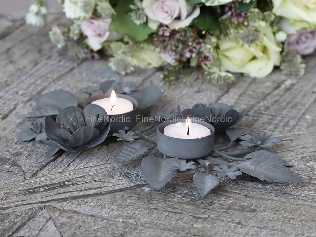 Der Chic Antique Kerzenhalter mit Blättern ist ein schönes Herzstück für einen Esstisch oder eine hübsche Dekoration für eine Anrichte. Der Antik zinkfarbene Kerzenhalter kann mit zwei Teelichtern bestückt werden, und diese werden von Metallblumen und -blättern umgeben. Seine längliche Form, das detaillierte Design und die hübsche graue Farbe machen ihn zum Mittelpunkt auf dem Tisch. Fügen Sie einfach zwei Teelichter hinzu und genießen Sie das entspannende Kerzenlicht. Das rustikale Aussehen des Teelichthalters passt perfekt in ein Landhaus und bietet einen schönen Kontrast in einer sehr modern eingerichteten Wohnung. Auch in einer Shabby Chic Einrichtung würde sich dieser Kerzenhalter ganz wie zu Hause fühlen.