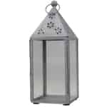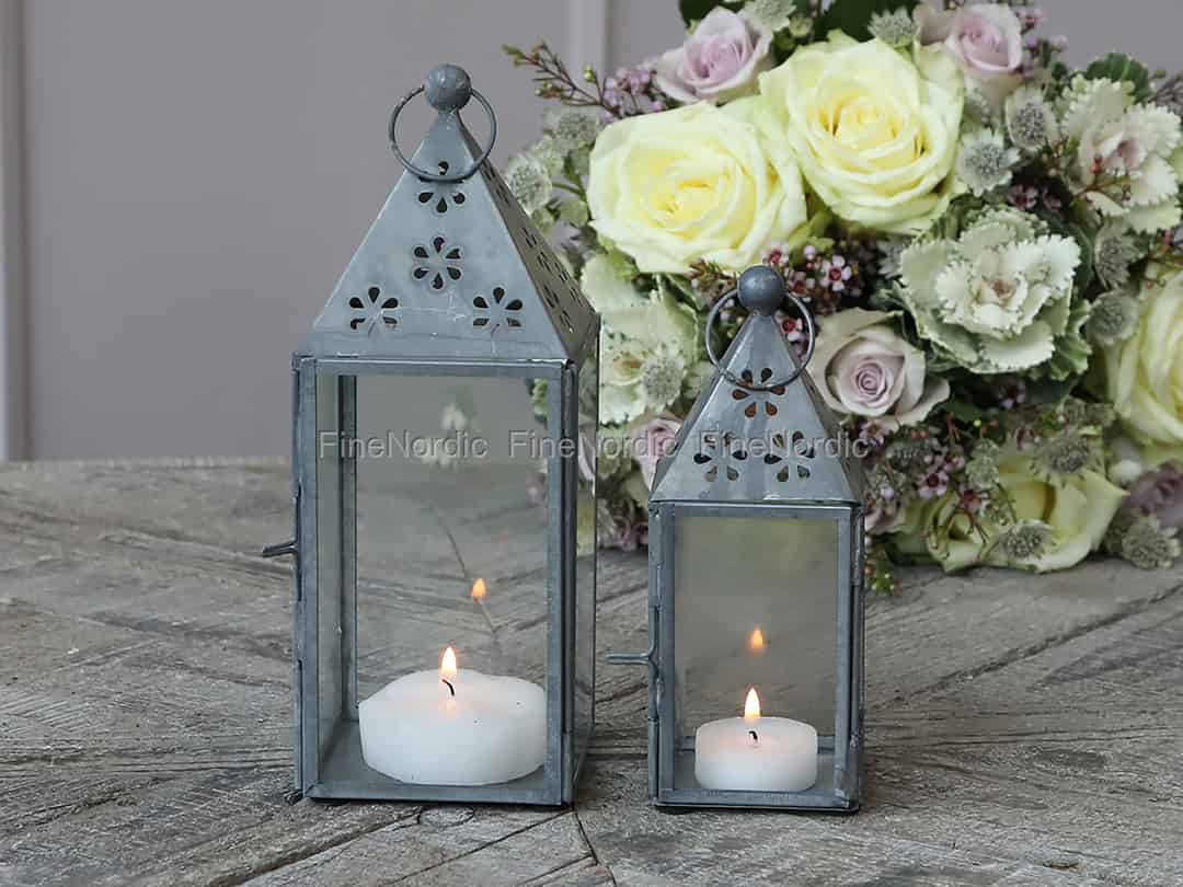 Die Laterne mit Muster von Chic Antique verschönert jeden Raum. Die große Laterne aus Antik Zink hat vier Glasseiten und je eine Metallober- und -unterseite. Die spitzdachähnliche Oberseite hat ein hübsch perforiertes Blumenmuster. An ihrer Spitze befindet sich ein runder Metallring, der es ganz einfach macht die Laterne von einer Stelle zur anderen zu bewegen. Die vordere Glastür hat einen kleinen Hebel, mit dem Sie die Laterne öffnen und schließen können. Befüllen Sie die Laterne mit einer Wachskerze, einer LED-Kerze, einer Lichterkette oder aber mit anderen Dekorationen, die Möglichkeiten sind schier endlos. Sie können diese graue Laterne auf eine Fensterbank, einen Tisch oder eine Kommode stellen und dort ihr gutes Aussehen genießen. Die Chic Antique Laterne mit Muster ist auch in einer kleineren Größe erhältlich.