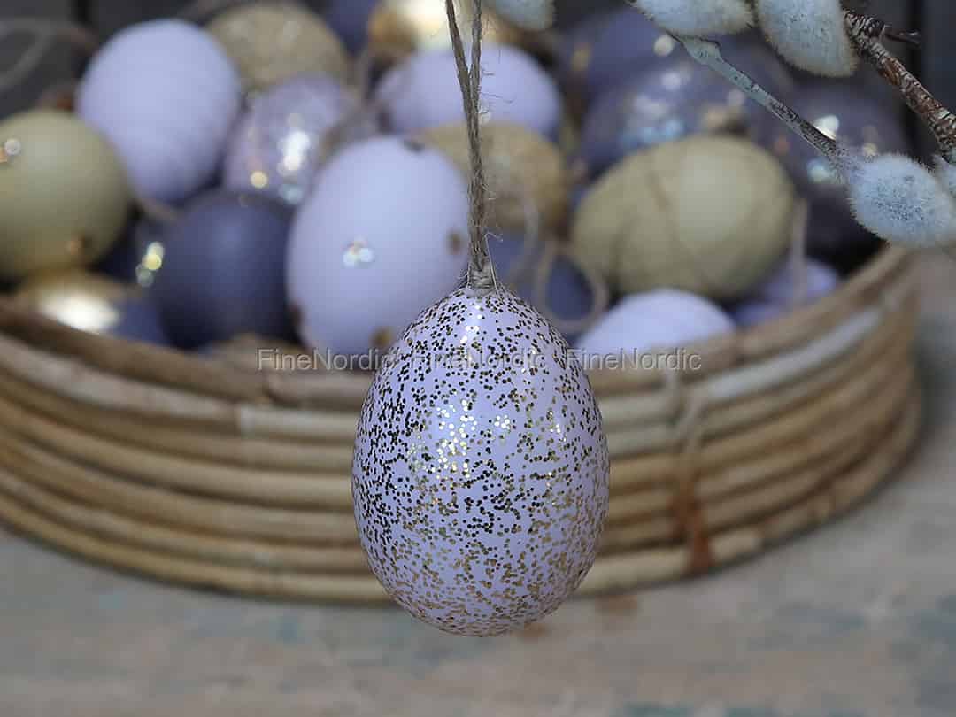 Fügen Sie Ihrem Osterkranz oder Ihrem Osterstrauch etwas Glanz und Glimmer hinzu mit diesem gut aussehenden Lavender Fog Osterei von Chic Antique. Das helllila Ei ist mit goldenen Glitzersprenkeln verziert und hängt an einer Juteschnur. Anstatt es aufzuhängen, können Sie es auch in einen Osterkorb oder eine Glasschüssel zusammen mit anderen Chic Antique Ostereiern legen. Wir haben eine schöne Auswahl an Ostereiern anzubieten und auch viele mit goldfarbenen Details. Sie finden sie alle in unserem Webshop und können sie beliebig kombinieren.
