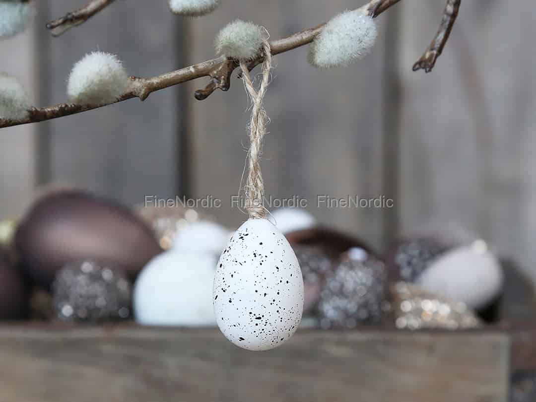 Dekorieren Sie Ihren Osterbaum mit den hübschen Ostereiern von Chic Antique. Wie zum Beispiel dieses weiße Ei, das mit schwarzen Spritzern geschmückt ist. Daran ist ein Juteschnur befestigt, so dass es ganz leicht aufzuhängen geht. Es ist ein sehr hübsche Osterdeko, wenn es von einem Weidenkätzchen Zweig oder einem Forsythien Zweig baumelt. Stellen Sie ein paar Zweige in eine stabile Vase und dekorieren Sie sie mit all den verschiedenen Chic Antique Ostereier, die wir anzubieten haben. Wir haben sie mit Federn, und mit Glitzer, sowie auch mit Streifen und Punkten. Schauen Sie sich gerne mal die schöne Auswahl an Chic Antique Ostereiern an, die wir in unserem Webshop vorrätig haben.