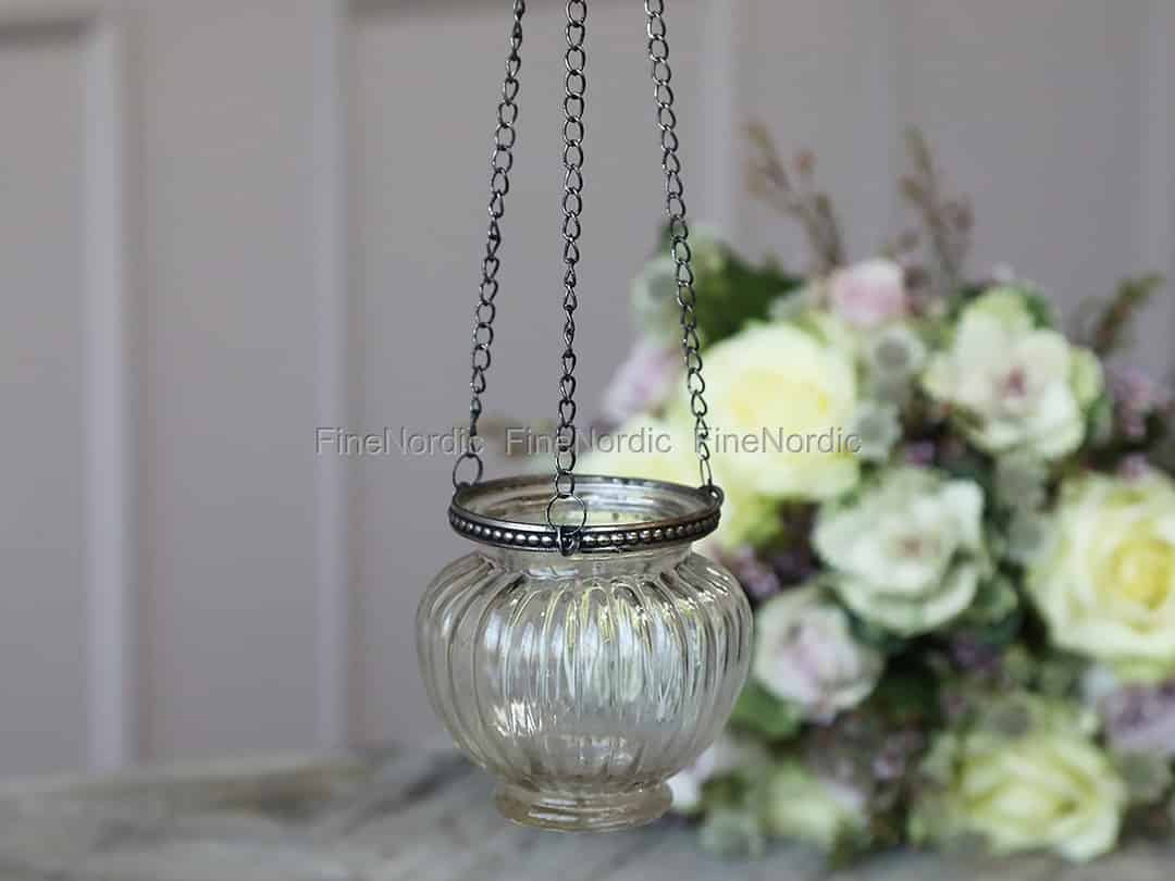Der Chic Antique Teelichthalter mit Hängeketten bringt Ihren Tag und besonders Ihre Nacht zum Leuchten. Fügen Sie einfach ihm einfach ein Teelicht hinzu und genießen Sie das schöne Kerzenlicht. Der Glaskerzenhalter hängt an drei Ketten, die oben zusammenkommen und an denen ein Haken befestigt ist. So können Sie diesen Kerzenhalter einfach an einem Wandhaken, einem Griff oder einem Ast anhängen. Verwenden Sie den Teelichthalter aus Glas sowohl im Alltag als auch zu festlichen Anlässen. Sie finden ihn auch in einer größeren Windlicht Version in unserem Webshop.