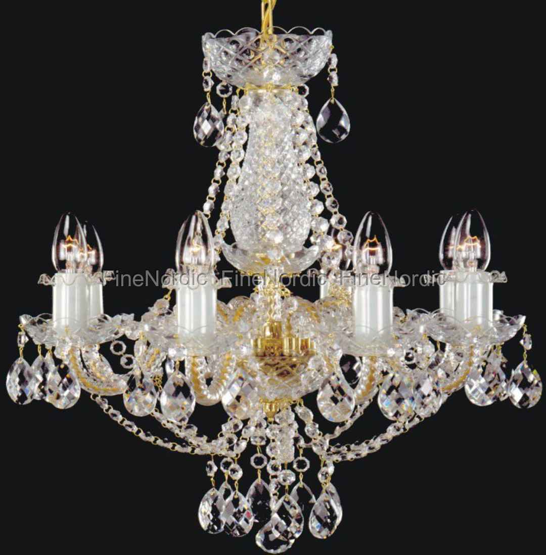 Schöner Kristall-Kronleuchter mit acht Armen aus echtem Swarovski Kristall. Die Metallteile sind aus Gold-Finish (Messing poliert). Er eignet sich besonders oberhalb eines Esstisches für sechs Personen. Ein Qualitätsprodukt, von klassischen Traditionen in der Tschechischen Republik hergestellt.