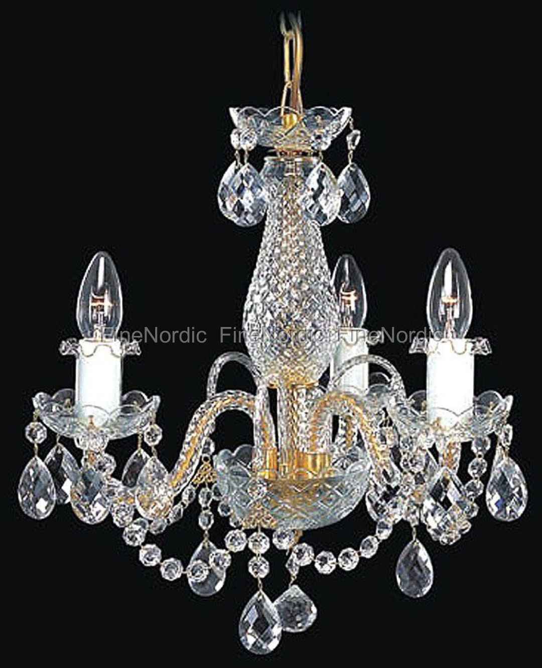 Schöner Kristall-Kronleuchter mit drei Armen aus echtem Swarovski Kristall. Die Metallteile sind aus Gold-Finish (Messing poliert). Der Kronleuchter benötigt drei Glühbirnen mit E14 Fassung mit bis zu 40W. Normalerweise nimmt man 25W Glühbirnen. Alle Kabel sind weiß, was eine schöne Optik für die eleganten Glasarme ergibt. Ein Qualitätsprodukt, von klassischen Traditionen in der Tschechischen Republik hergestellt.