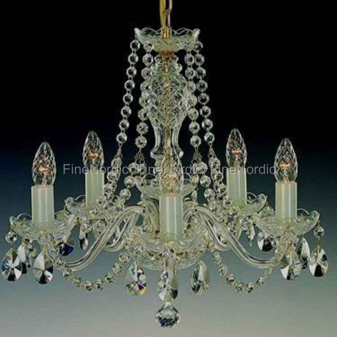 Schöner Kristall-Kronleuchter mit fünf Armen aus echtem Swarovski Kristall. Die Metallteile sind aus Gold-Finish (Messing poliert). Er eignet sich besonders oberhalb eines kleinen Esstisches für vier Personen. Ein Qualitätsprodukt, von klassischen Traditionen in der Tschechischen Republik hergestellt.