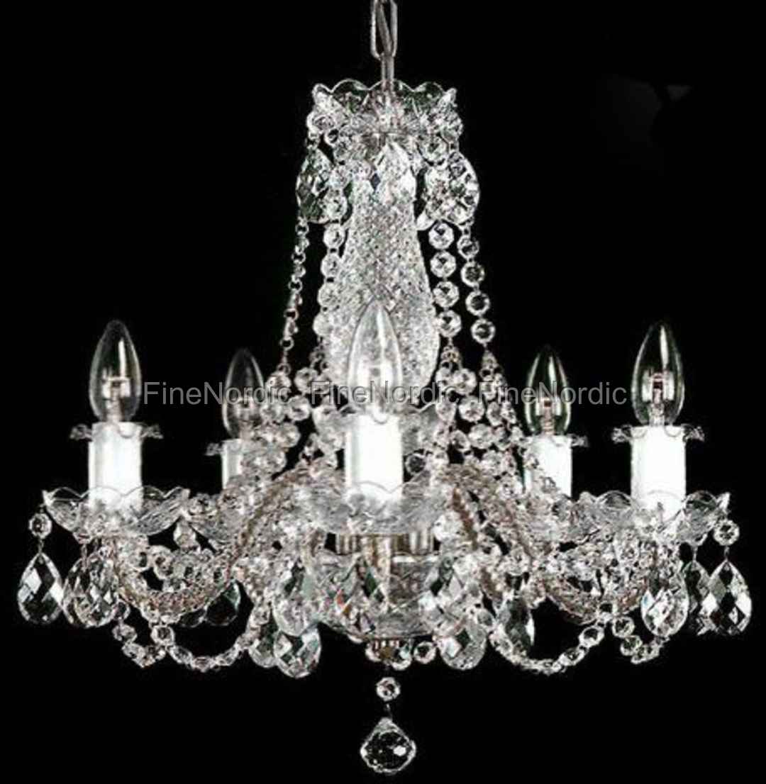 Wunderbarer Kristall-Kronleuchter mit fünf Armen aus echtem Swarovski Kristall. Die Metallteile sind aus Silber-Finish (Messing vernickelt). Er eignet sich besonders oberhalb eines kleinen Esstisches für vier Personen. Ein Qualitätsprodukt, von klassischen Traditionen in der Tschechischen Republik hergestellt.