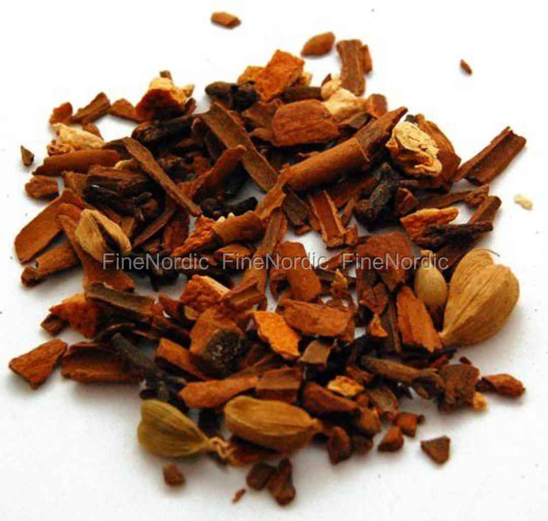 Gløggblanding. Lækkert gløggkrydderi som rækker til gløgg af 4 flasker rødvin. Krydderiblanding til glögg med kanelbark, kardemomme, nelliker og orangeskal. Gløgg blandingen giver en herlig glögg. Pakket i 100 grams pose (billedet af indholdet viser kun 1 teskefuld). Opskrift på gløgg følger her. Ingredienser til gløgg: 25 gr. Gløgg blanding 1 dl snaps eller rom 1 fl. rødvin 100 gr. sukker (1 1/4 dl) 50 gr. hakkede mandler (1 dl) 50 gr. rosiner (1 dl) Først den hurtige opskrift - hvis du ikke er i så god tid: 1. Kom Gløgg krydderierne i et tefilter og luk med en teclips. 2. Herefter kommes 3 dl vand i en kasserolle og koges med filterposen i 10-15 min. 3. 1 fl. rødvin tilsættes samt desuden 100 gr. sukker (1 1/4 dl), 50 gr. rosiner og 50 gr. mandler. 4. Kasserollens indhold opvarmes nu (må ikke koge). 5 Efter behag kan der suppleres med snaps, rom eller portvin. Sådan laver man gløggen, hvis man har mulighed for at starte dagen før: 1. Kom Gløgg krydderierne i et tefilter og luk med en teclips. 2. I et glas hældes 1 dl snaps eller rom, drop heri tefiltret, som derefter trækker et døgn. 3. Næste dag hældes en flaske rødvin i en gryde og man tilsætter glassets indhold. 4. Det hele opvarmes (ikke koges) og man tilsætter sukker, rosiner og mandler efter behag. Der har nu bredt sig den sødeste juleduft i huset og du kan servere den herligste gløgg. Velbekomme!