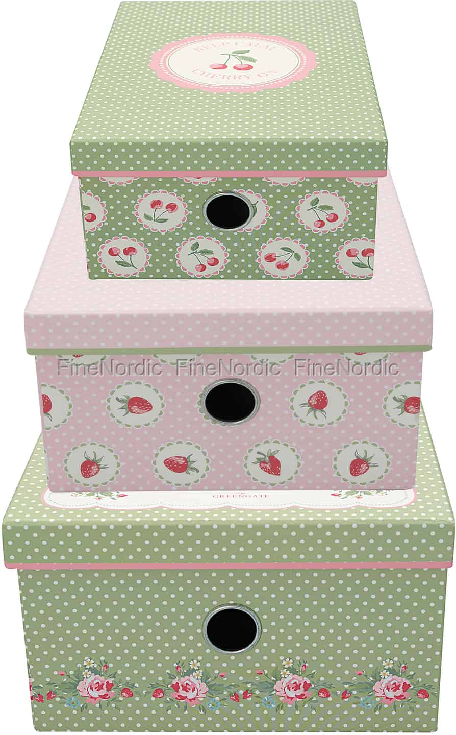 Die Aufbewahrungsboxen Mary White von GreenGate werden als 3er Set geliefert. Die kleinste hat ein Kirschmuster, die mittlere ein Erdbeermuster und auf der größten sieht man Rosen. Die kleine und große Schachtel hat einen hellgrünen Hintergrund mit weißen Punkten und die mittlere Schachtel ist rosa mit weißen Punkten. Jede Box hat ein rundes Loch auf der Vorderseite, sodass Sie leicht sehen können, was Sie in der Box aufbewahren. Sie können einfach jeden Deckel abnehmen, um so zu Ihren gut verstauten Dingen zu gelangen. Das Aufbewahrungsset Mary White von GreenGate sieht nicht nur wunderbar aus, sondern hilft Ihnen auch dabei Ihre Sachen aufgeräumt und gut verstaut zu haben.