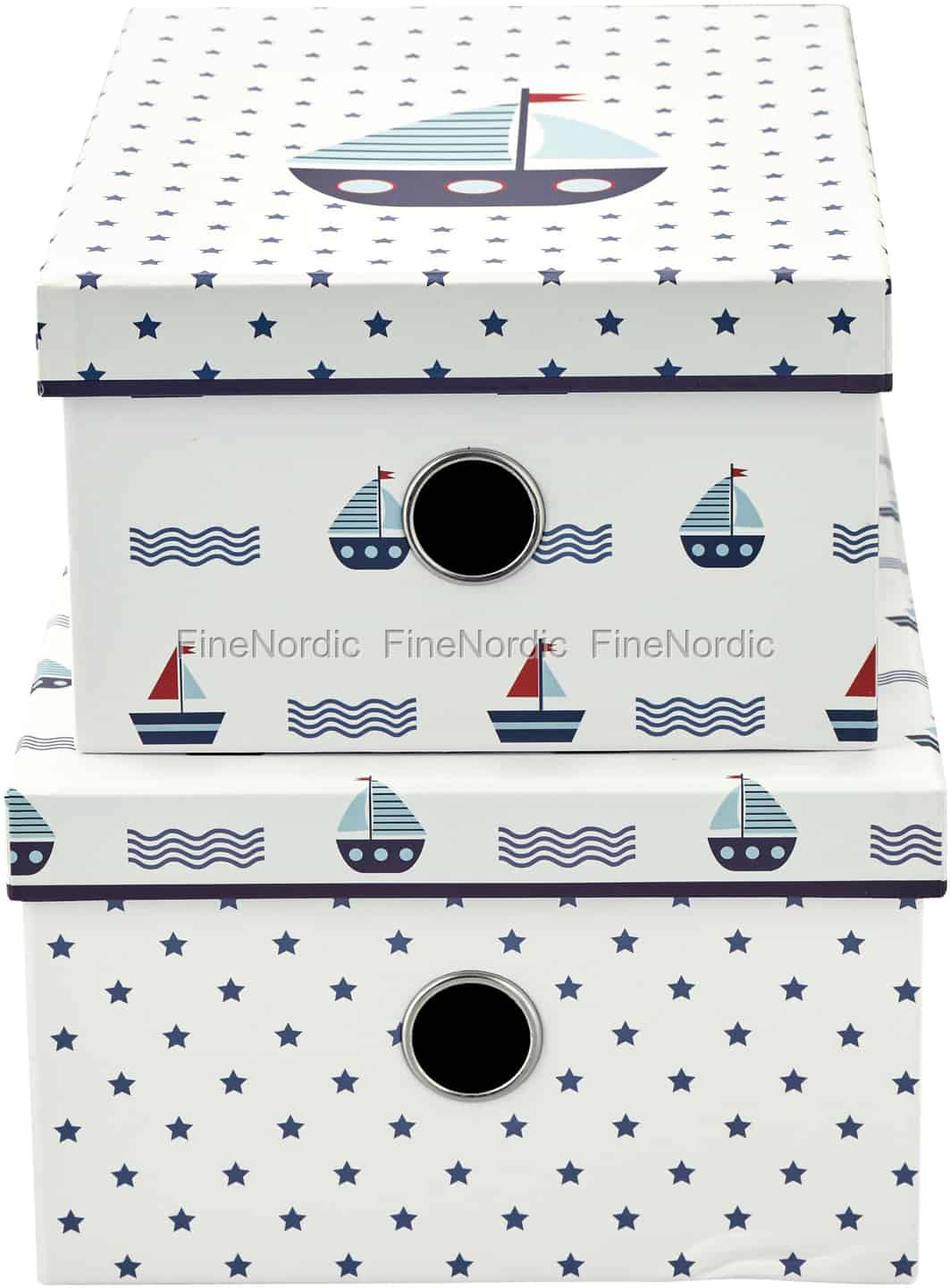Sorgen Sie mit dem Aufbewahrungsbox-Set Noah White von GreenGate für Ordnung im Kinderzimmer. Die kleinere Kiste zeigt ein großes Schiff in der Mitte des Deckels, das von kleinen blauen Sternen umgeben ist. Der Deckel der größeren Kiste ist mit Wellen und kleinen Schiffen verziert. Die beiden Boxen sehen sehr gut zusammen aus, sie können aber auch einzeln verwendet werden. Sie sind auch ein schönes Geburtstagsgeschenk für ein süßes kleines Matrosenmädchen oder einen lieben kleinen Matrosenjungen.
