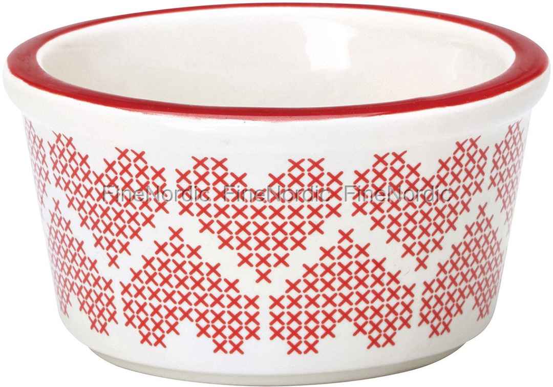 Das GreenGate Auflaufförmchen Ramekin Micha Red kann auf viele verschiedene Arten verwendet werden. Sie können darin etwas backen, ein Dessert darin servieren, oder es als kleine Snackschüssel verwenden. Die Außenseite ist mit einem roten Herzmuster bedeckt, welches aussieht, als wäre die Form mit Kreuzstichen bestickt worden. Die Form hat oben einen roten Rand und die Innenseite ist einfarbig. Sie hat einen Durchmesser von 10,5 cm und ist 5,8 cm hoch. Das Auflaufförmchen Micha Red sieht nicht nur gut aus, sondern ist auch ein nützliches Küchenaccessoire.