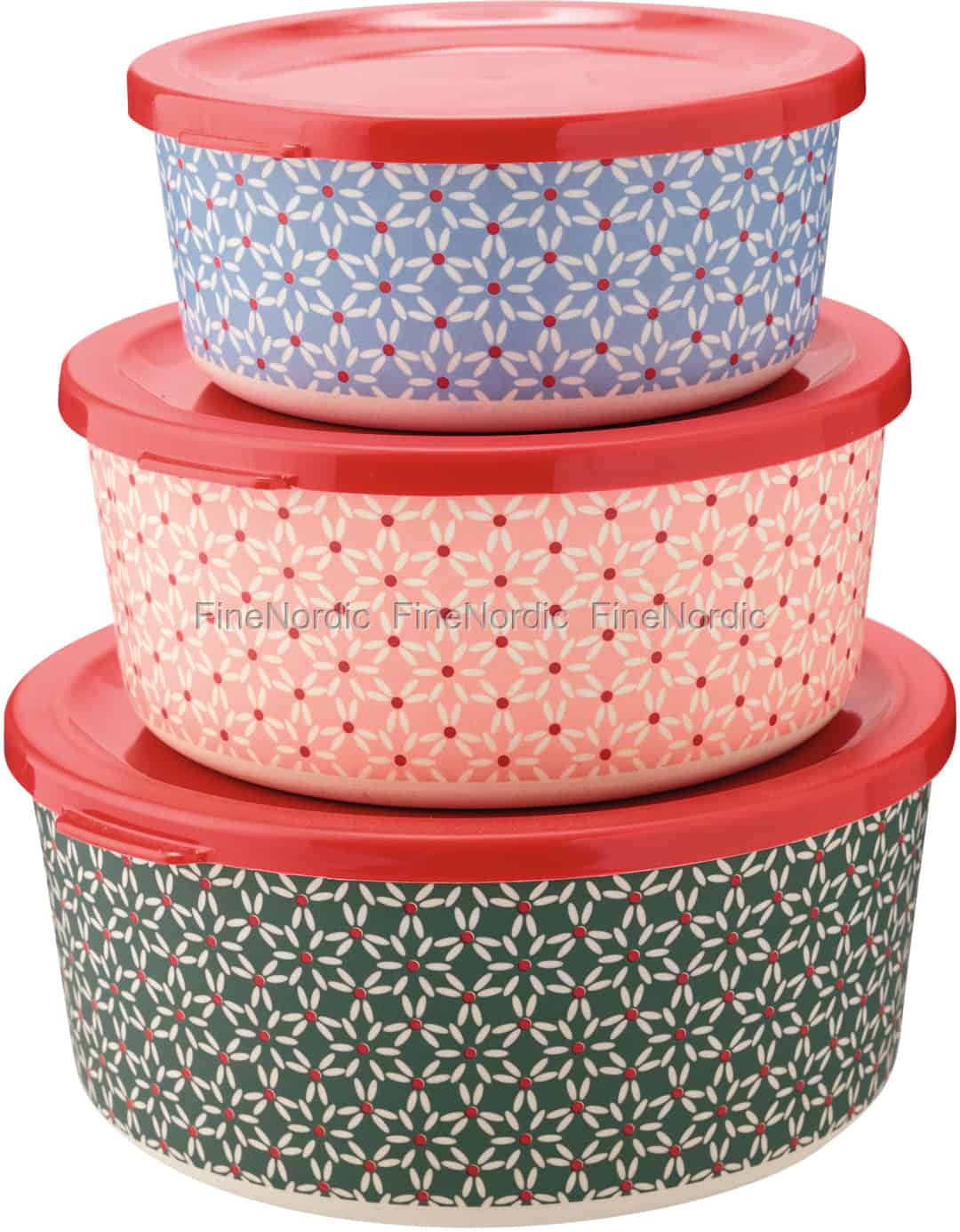 Bewahren Sie u.a. Ihren Salat, Plätzchen, Reste sicher in diesem 3-teiligen runden Set an Bambusboxen von GreenGate auf. Das Juno Green Set beinhaltet drei Boxen in verschiedenen Größen, alle mit demselben geometrischen Blumenmuster, aber jede Box hat eine andere Farbe. Auch jeweils ein roter Deckel liegt jeder Box bei und die 3 Behälter können gut übereinander gestapelt werden. Wenn Ihnen das Juno Muster gefällt, dann sollten Sie sich vielleicht auch die anderen schönen Juno Produkte ansehen, die wir in unserem Online-Shop anzubieten haben.