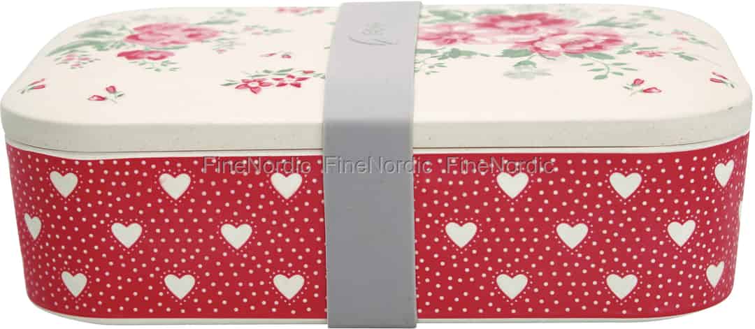 Die Bambuslunchbox Elouise White von GreenGate überzeugt mit ihren hübschen Mustern und Farbkombinationen. Der Deckel des tragbaren Essensbehälters ist mit einem wunderschönen Blumenmuster in Rot, Rosa, Grau und Grün geschmückt, und die rote Dose ist mit einem hellfarbenen Herzen- und Pünktchenmuster verziert. Das graue Gummiband legt man um die Dose herum und sichert damit, dass nichts aus der Bambusbox herausfallen kann. Die hübsche Brotdose kann Sie bei längeren Fahrten, bei Ausflügen, sowie auch zu Ihrer täglichen Mittagspause auf der Arbeit begleiten. Und wenn sie beschmutzt ist, legen Sie sie einfach zur Reinigung in den oberen Korb Ihrer Spülmaschine und schon bald ist sie wieder einsatzbereit.