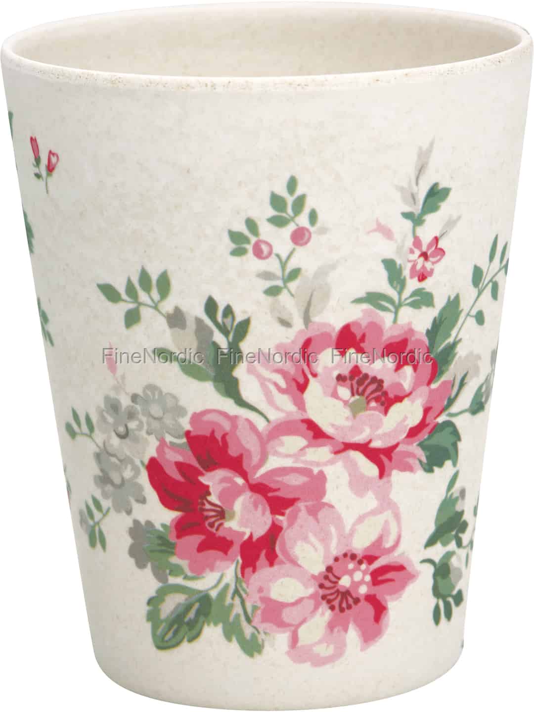 Die Bambustasse Elouise White von GreenGate ist mit einem hübschen Blumenmuster, in den Farben Rot, Rosa, Grün und Grau, geschmückt. Der henkellose Trinkbecher kann zum Trinken von Wasser, Saft, Milch und vielen anderen Getränken genutzt werden. Der Bambusbecher kann gut mit den anderen Produkten der Elouise White Serie kombiniert werden, sowie auch mit vielen Bambusprodukten und Stoneware aus anderen GreenGate Serien.