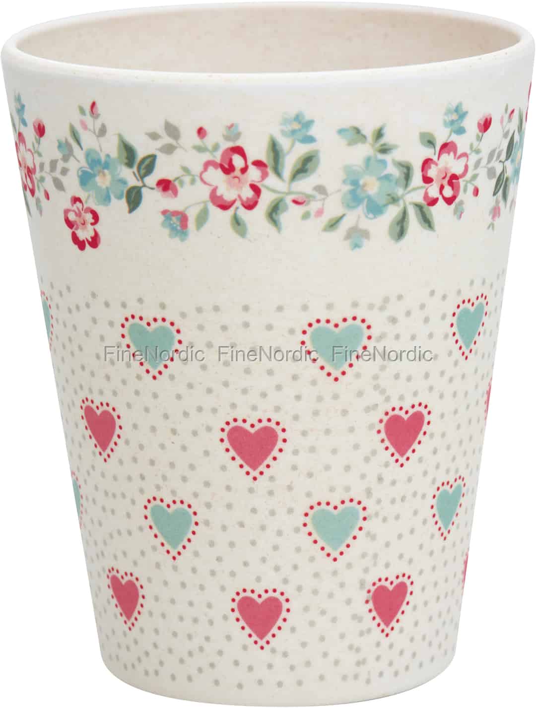 Eine Kombination aus Herzen- und Blumenmuster schmückt die hübsche Sonia White Bambustasse von GreenGate. Eine Blumenranke aus Rot, Grün und verschiedenen Pastellfarben umkreist die obere Hälfte des henkellosen Trinkbechers und darunter sind süße, pastellfarbene Herzchen und Pünktchen zu sehen. Aus dem hübschen Trinkbecher genießt man gerne mal ein Erfrischungsgetränk, ganz egal ob es Wasser, Saft oder Milch ist. Der Bambusbecher kann gut mit den anderen Sonia Bambusprodukten, sowie auch mit der Sonia Stoneware von GreenGate kombiniert werden.