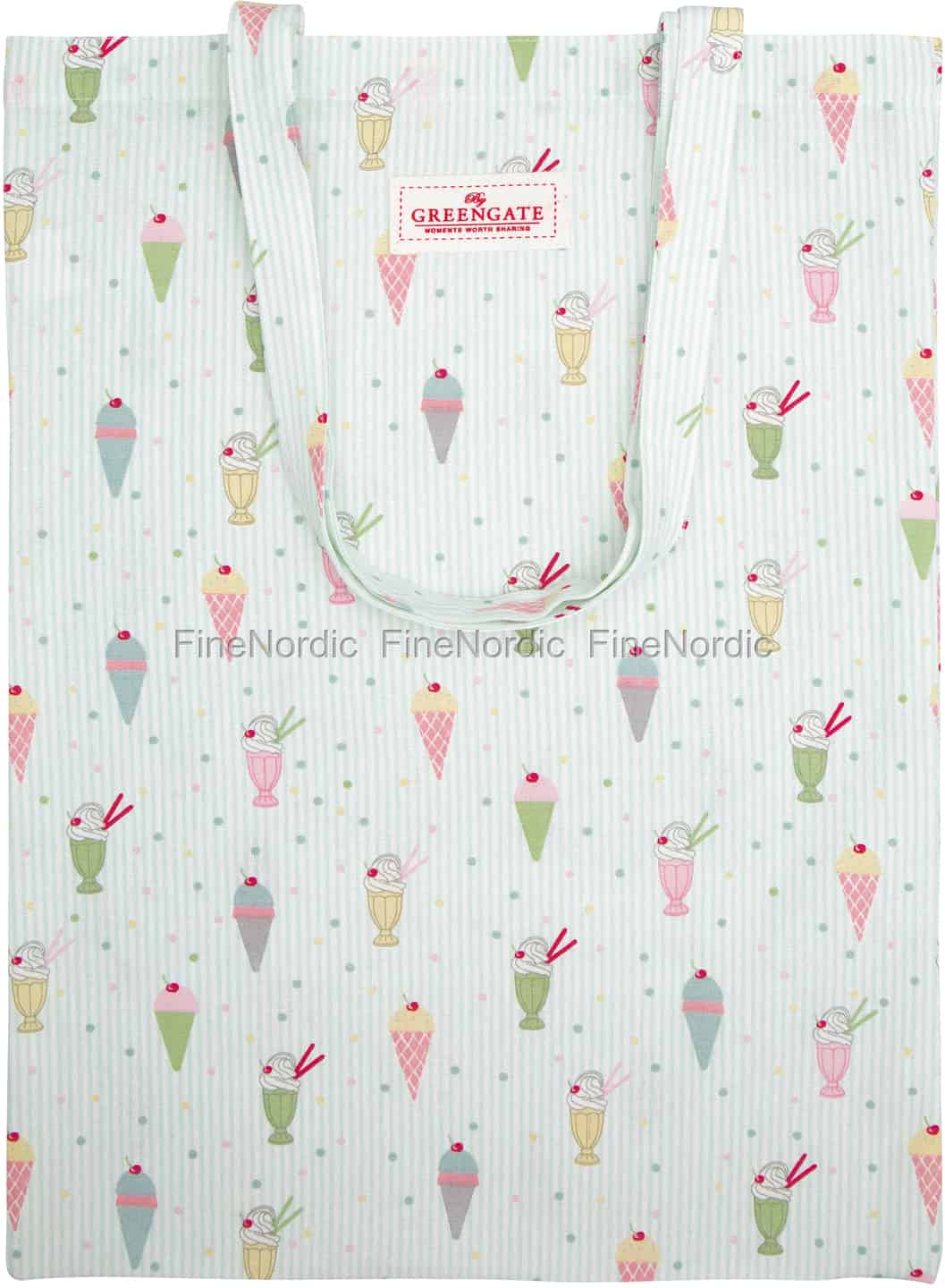 Die Isa Pale Blue Baumwolltasche von GreenGate ist mit einem pastellfarbenen Muster aus Punkten, sowohl wie mit Eisbechern und -waffeln geschmückt und der hellblaue Hintergrund ist fein gestreift. Das bekannte GreenGate Label ist auch darauf genäht und der Baumwollbeutel ist, zwecks seiner zwei Henkeln, auch sehr leicht zu tragen. Nehmen Sie ihn zusammengefaltet in der Handtasche mit, denn so haben Sie ihn immer parat, wenn Sie unterwegs einen Beutel benötigen. Auch für den täglichen Einkauf ist die Einkaufstasche gut zu gebrauchen, denn dank dieses nachhaltigen Beutels, können Sie so auf den Kauf einer Plastiktüte verzichten. Der hübsche Henkelbeutel aus GreenGates Isa Pale Blue Serie bietet sich mit seinem sommerlichen Eis Motiv auch gut als Strandtasche an.