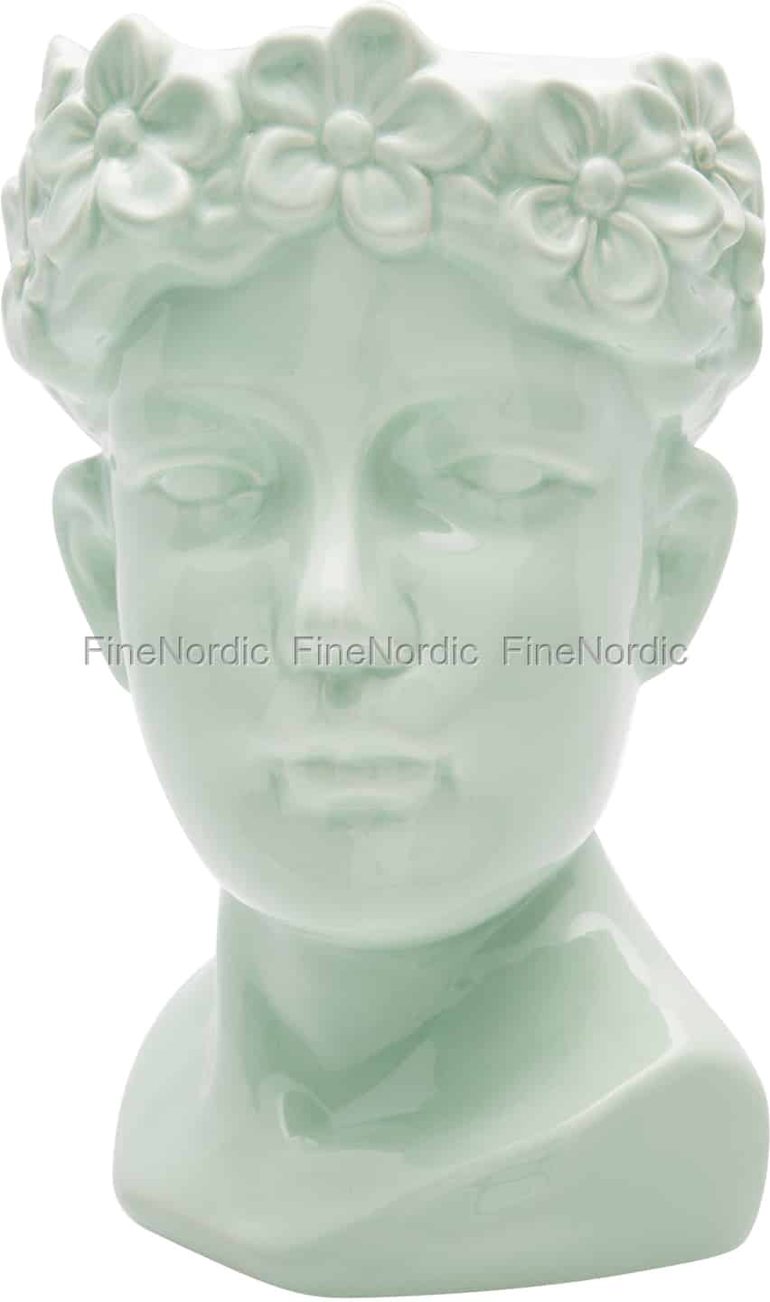 Der GreenGate Blumentopf mit Gesicht hebt sich von regulären Blumentöpfen ab, da er mehr dem Kopf einer romanischen Statue als einer Vase ähnelt. Der Keramik Blumentopf hat eine hübsche blassgrüne Farbe und trägt einen Blumenkranz um den Kopf. Befüllen Sie ihn mit einer schönen Topfpflanze oder verwenden Sie ihn als Vase für einen hübschen Blumenstrauß. Der Blumentopf mit Gesicht wird Aufmerksamkeit erregen, egal wo in der Wohnung Sie ihn hinstellen werden. Er ist ein schöner Blickfang und kann auch als Gesprächsstarter bei einer Party dienen. Dazu ist er auch eine wunderbare Geschenkidee für einen lieben Freund, der gerne Geschenke mag, die eher etwas ungewöhnlich sind.