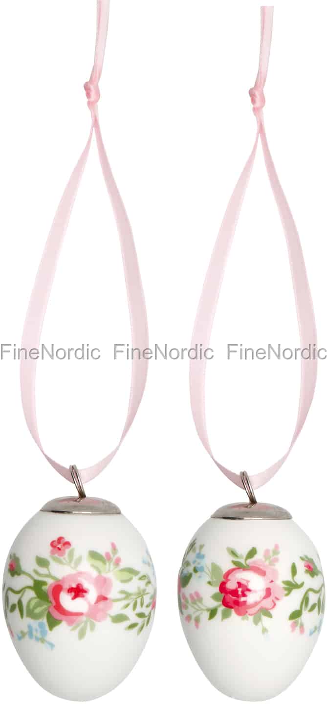 Dekorieren Sie Ihr Zuhause für Frühling und Ostern mit diesen beiden bezaubernden Gabby White Eiern von GreenGate. Dieses dekorative Eier Paar besteht aus Porzellan und die sie sind je mit einem rosa Band versehen. Die Eier sind mit dem wunderschönen Gabby White Blumenmuster geschmückt, welches beide Eier umkreist. Hängen Sie sie an einen Ast oder an ein paar blühende Zweige in einer Vase und genießen Sie ihr gutes Aussehen. Sie können sie auch als kleines Bonusgeschenk an ein schön verpacktes Ostergeschenk binden. Das Gabby White Eier 2er Set ist auch eine schöne Geschenkidee für einen GreenGate Fan und Sammler.