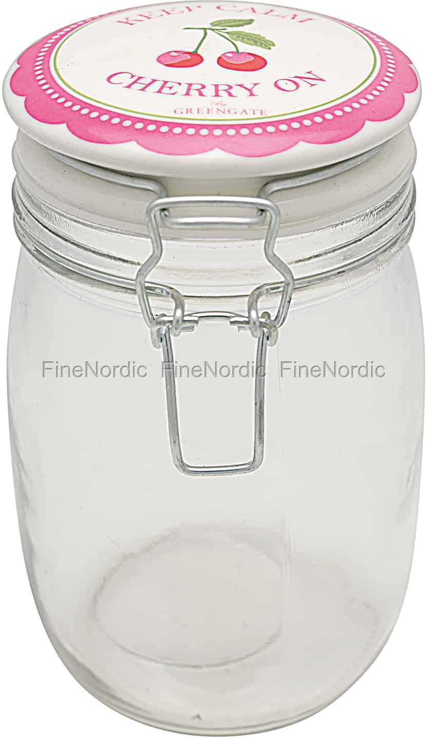 Das Vorratsglas von GreenGate Cherry Berry Pale Pink bietet eine attraktive Art und Weise, Ihre Sachen aufzubewahren. Das Glas hat ein Fassungsvermögen von 1 Liter und kann für selbstgemachte Marmelade, Apfelmus, eingelegte Gurken und vieles mehr verwendet werden. Das Aufbewahrungsglas ist durchsichtig, sodass Sie ganz leicht einen guten Überblick über Ihr Eingemachtes haben können. Auf dem verschließbaren Deckel sind in der Mitte ein Paar Kirschen zu sehen und da drüber und drunter können Sie die Wörter: Keep Calm Cherry On by GreenGate, lesen. Der Porzellandeckel hat einen wellenförmigen rosa Rand mit weißen Tupfen. Sie können in dem Glas auch einige Backzutaten wie Zucker, Mehl oder Kakao aufbewahren Aufgrund seines guten Aussehens können Sie ihn direkt auf der Küchentheke hinstellen und er muss nicht in den Schrank verschwinden. Füllen Sie ihn mit selbstgemachten Leckereien und schon ist er ein schönes Geschenk für einen lieben Freund.