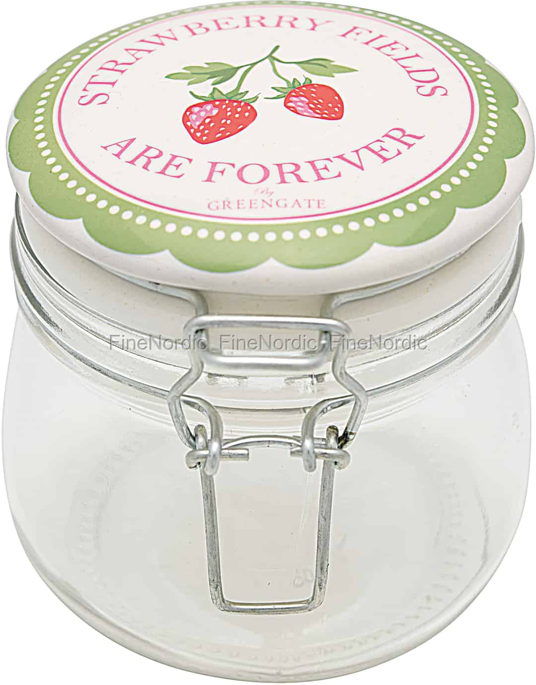 Der Aufbewahrungsbehälter Strawberry Pale Green von GreenGate besteht aus Glas und hat einen verschließbaren Porzellandeckel. Der Deckel zeigt ein paar Erdbeeren in seiner Mitte mit den Worten: Strawberry Fields are Forever by GreenGate. Der Verschlussdeckel hat eine grüne wellenförmige Umrandung mit weißen Punkten. Das Aufbewahrungsglas hat eine Kapazität von 500 ml und Sie können alle möglichen Dinge darin aufbewahren. Von Marmelade oder eingelegten Gurken bis hin zu Mehl, Zucker oder Kakao. Dieses Aufbewahrungsglas bewahrt nicht nur Ihre Lebensmittel sicher auf, sondern es ist auch schön anzusehen. Das Aufbewahrungsglas von GreenGate ist auch in einer 1 Liter Version mit Kirschen auf dem Deckel erhältlich.