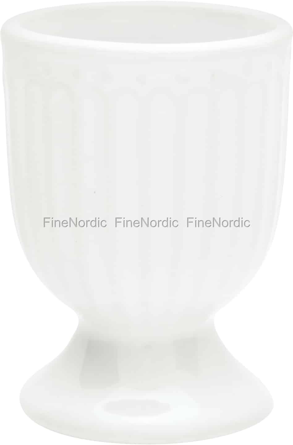 Das Frühstücksei schmeckt gleich doppelt so gut, wenn es in einem so schlichten, jedoch sehr stilvollen Eierbecher, wie der Alice White Eierbecher von GreenGate, serviert wird. Der weiße Porzellaneierbecher ist auf seiner Außenseite mit einem hübschen Relief geschmückt und die Innenseite und der Fuß sind glatt. Der im klassischen Weiß gehaltene Feinkeramikeierbecher sieht nicht nur gut aus, er kann auch mit Stoneware von vielen GreenGate Serien kombiniert werden. Sie können den Frühstückstisch mit dem Alice White Porzellan ganz monochrom weiß eindecken oder aber ein paar gemusterte, bunte Geschirrteile aus anderen Serien dazustellen, um so den Tisch noch einladender und lebhafter aussehen zu lassen.