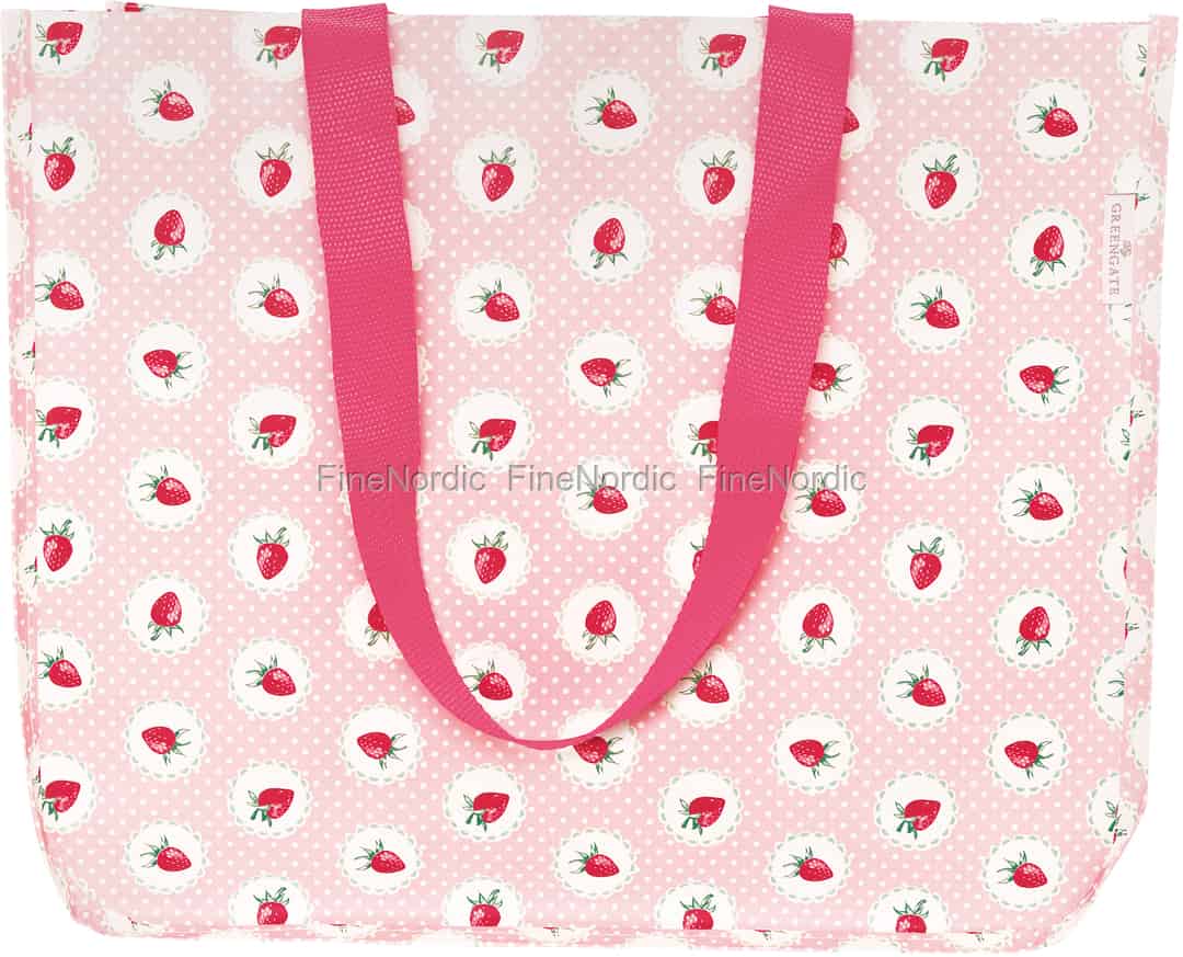 Werfen Sie doch mal einen Blick auf diese schöne Einkaufstasche, die mit einem hübschen Erdbeermuster verziert ist. Die rosafarbene Tasche ist mit kleinen weißen Punkten bedeckt. Darauf können Sie auch größere weiße Kreise sehen, in deren Mitte je eine Erdbeere liegt. Die attraktive Tasche kann Sie bei Ihrer Shoppingtour, bei einem Tag am Strand oder zu einem Picknick im Park begleiten. Der Shopper ist leicht an den zwei Griffen zu schultern und es passt auch ziemlich viel in die Tasche. Wenn Ihnen das Strawberry Pale Pink Muster gefällt, dann möchten Sie sich vielleicht auch alle anderen GreenGate Produkte ansehen, die wir mit demselben Design anbieten. Sie finden das gleiche Muster auf Bambusartikeln, Textilien und sogar einem Rucksack wieder.