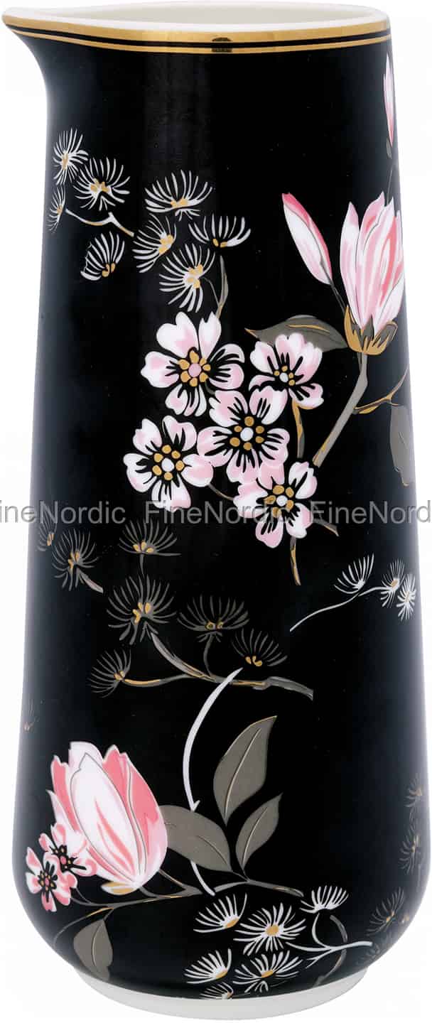 Der GateNoir Krug Amelie Black von GreenGate ist mit einem wunderschönen rosa und goldenen Blumenmuster auf schwarzem Hintergrund verziert. Der Porzellankrug fasst 0,7 Liter und kann als Wasserkrug, Milchkrug oder sogar Saftkrug verwendet werden. Der grifflose Krug hat einen großen Auslauf, mit dem Sie die Flüssigkeiten leicht in Ihr Glas gießen können. Dieser zarte Krug ist wegen seiner schönen goldenen Akzente weder spülmaschinen- noch mikrowellengeeignet. Sie können ihn gerne mit den anderen exquisiten Amalie Geschirrteilen kombinieren oder ihn neben einfarbigen Gerichten besonders hervorheben lassen.