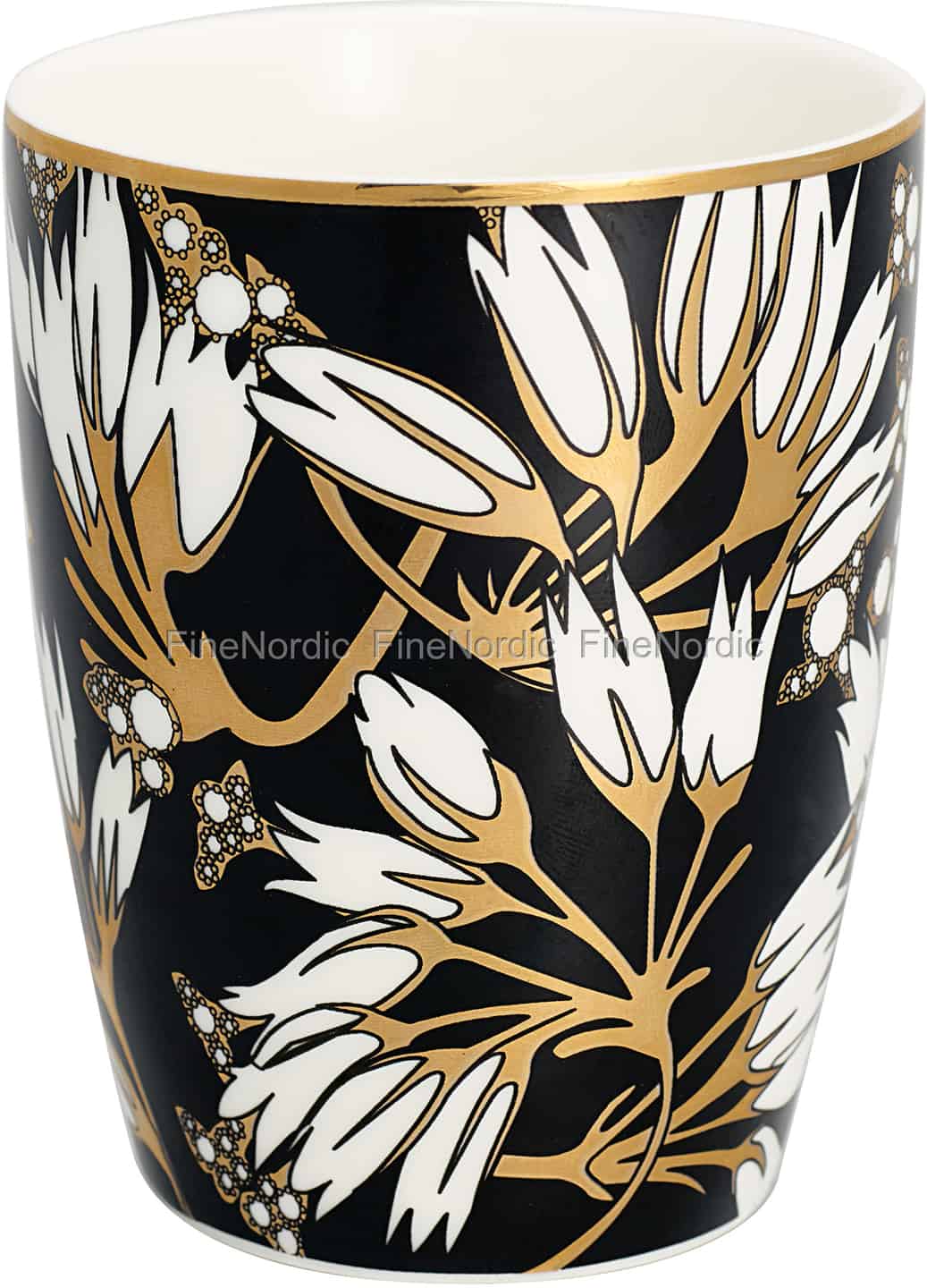 Genießen Sie morgens als erstes einen aromatischen Tee oder Kaffee mit dieser wunderschönen Florette Black Latte Tasse und dann wird es ganz sicher ein richtig guter Tag werden. Das gold-weiße Blumendesign sieht auf dem kräftigen schwarzen Hintergrund der Tasse einfach fantastisch aus und der goldfarbene Rand verleiht ihr den letzten eleganten Touch. Dieser Porzellanbecher fasst bis zu 400 ml und sollte aufgrund seiner goldenen Akzente nur von Hand gewaschen werden. Diese grifflose Tasse ist Teil der glamourösen GateNoir Kollektion von GreenGate, die aus Geschirr besteht, das vom luxuriösen Art Deco Stil der 1920er Jahre inspiriert ist. Sie können die verschiedenen GateNoir Serien kombinieren und Ihrem Tisch etwas aufregendes verleihen.