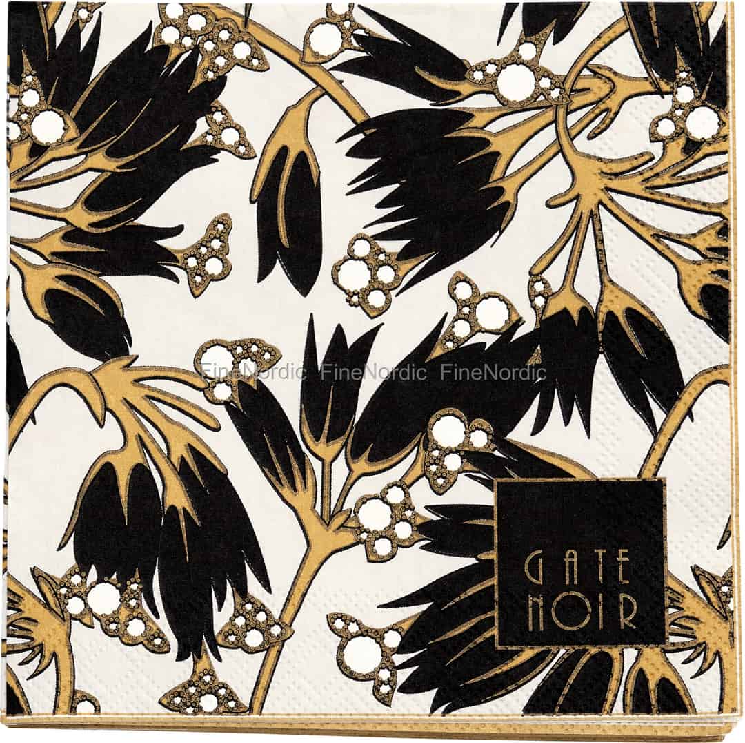 Für Ihre nächste Cocktailparty oder Ihren Sonntagsbrunch sind diese Florette Black Papierservietten aus der exquisiten GateNoir Kollektion von GreenGate die perfekten Servietten. Die kleinen Servietten werden in einer Packung mit 20 Stück geliefert und haben ein sehr stilvolles Blumenmuster. Das schwarz-goldene Art Deco Design fällt auf dem weißen Hintergrund der Servietten ganz besonders auf und das GateNoir Label vervollständigt ihren luxuriösen Look. Verwenden Sie sie mit dem Florette Geschirr oder lassen Sie sie neben einfarbigen Gerichten hervorleuchten. Dieses Servietten Set ist auch ein schönes Gastgeschenk für eine Freundin, die die glamourösen zwanziger Jahre liebt.