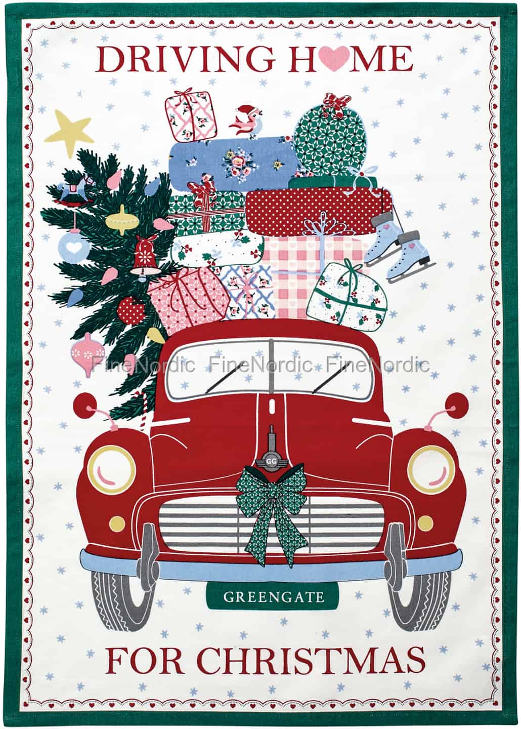 Viel Spaß in der Küche wünschen wir Ihnen mit diesem entzückenden Geschirrtuch von GreenGate! Das Christmas Car Red Geschirrtuch zeigt ein altes rotes Auto mit einem GreenGate Nummernschild, beladen mit einem Stapel Weihnachtsgeschenken und einem Weihnachtsbaum. Sie können darauf auch die Wörter: „Driving home for Christmas“ lesen und es wird von roten Herzen und einer grünen Kante umrandet. Wenn Sie es nicht gerade für den Abwasch gebrauchen, dann können Sie es auch an einem Haken aufhängen und so dient es Ihnen in der Weihnachtszeit gleich auch als Dekoration. Sollten Sie in dieser Jahreszeit zu einem Abendessen eingeladen werden, dann kann es auch als wunderschönes Gastgeschenk genutzt werden.