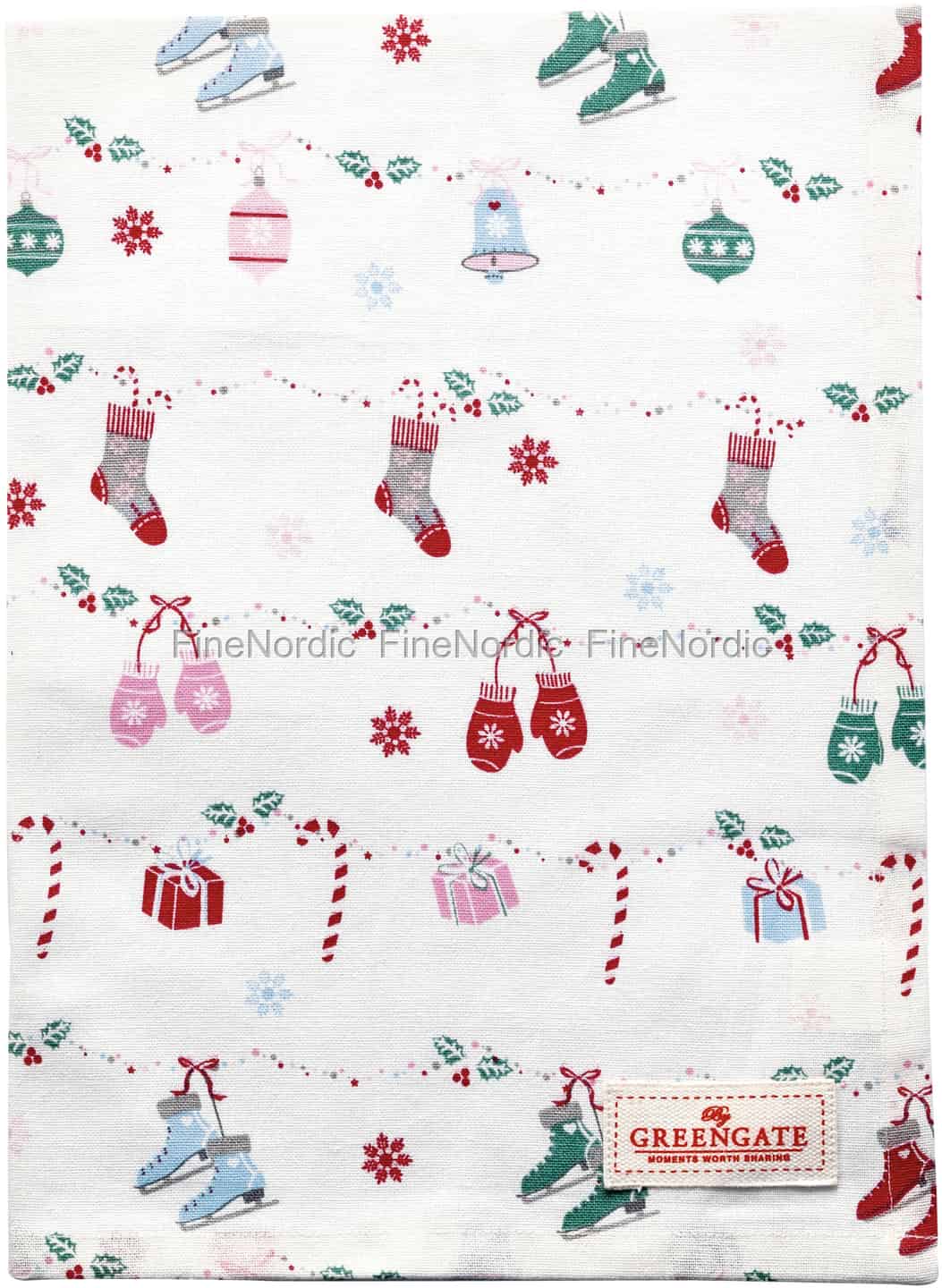 Allein schon, wenn man sich dieses Geschirrtuch ansieht, verspürt man die Lust, Weihnachtslieder singen zu wollen. Das Jingle Bell White Geschirrtuch von GreenGate verbreitet eine wohlige Weihnachtsstimmung in der Küche. Verwenden Sie es für den Abwasch, zum Abdecken von frisch Gebackenem oder zum Auslegen eines Brotkorbs und natürlich um Ihrem Zuhause ein wenig Weihnachts-Feeling hinzuzufügen. Das hinreißende Jingle Bell White Muster besteht aus mit Stechpalmen verzierten Girlanden, an denen Sie alles von Strümpfen, über Zuckerstangen, bis hin zu Schlittschuhen hängen sehen können. Schauen Sie sich gerne mal all die bezaubernden Jingle Bell White Produkte an, die wir in unserem Webshop anzubieten haben.