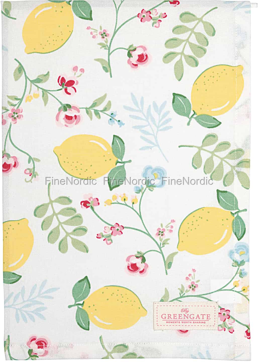 Zitronen eignen sich nicht nur für die Zubereitung von Limonade, sie sehen auch wunderbar auf diesem Limona White Geschirrtuch von GreenGate aus. Gelbe Zitronen, grünblättrige Stiele und zarte kleine Blüten sind Teile dieses Musters. Die verschiedenen Pastellfarben harmonieren sehr gut miteinander auf dem hellen Hintergrund. Das Geschirrtuch aus 100% Baumwolle kann bei 40 ° C in der Waschmaschine gewaschen werden. Wenn Sie Zitrusfrüchte mögen, werfen Sie doch mal einen Blick auf alle GreenGate Limona White Produkte, die wir in unserem Webshop anbieten. Es gibt hier eine große Auswahl an Textilien und Geschirrprodukten zu entdecken, denn in der Limona White Serie finden Sie sogar eine Duftkerze und eine zitronenförmige Geldbörse.