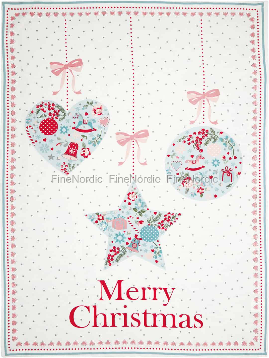 Auch in der Weihnachtszeit müssen Küchenarbeiten erledigt werden, aber diese gehen einem sicher schnell von der Hand, wenn man dabei von diesem hübschen Geschirrtuch unterstützt wird. Das Sandie White Pieceprinted Geschirrtuch von GreenGate ist mit einem hübschen Herz-, Stern- und Kugelornament geschmückt und darunter sind in roten Buchstaben die Worte Merry Christmas zu lesen. Die Ornamente sind mit vielen Weihnachtsmotiven verziert, wie Geschenke, Schaukelpferde, Glocken und mehr. Das rechteckige Küchentuch wird von einer hellblauen Linie, einer gepunkteten roten Linie und mit rosa Herzchen eingerahmt und auf dem hellen Hintergrund sind viele kleine Pünktchen zu sehen, die an fallenden Schnee erinnern. Das Sandie White Geschirrtuch von GreenGate ist auch ein tolles Gastgeschenk, wenn man während den Feiertagen wo eingeladen wird.