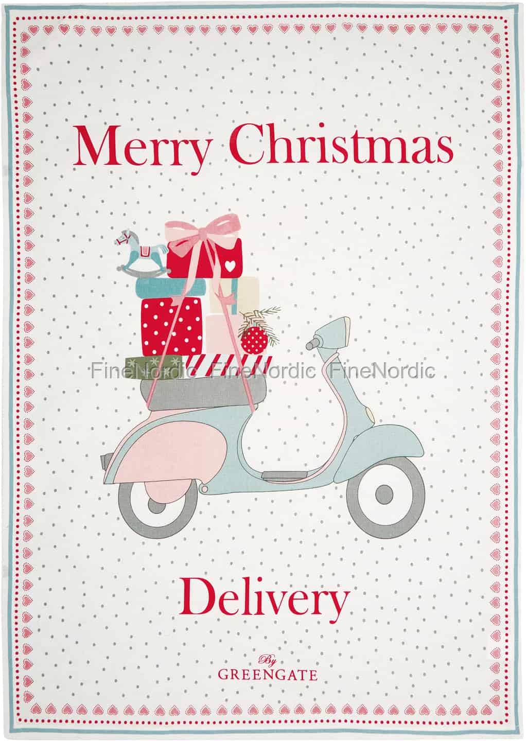 Geschirrtücher sind praktische Küchenhelfer, aber das bedeutet ja nicht, dass sie nur funktionell sein müssen. Sie können dazu auch sehr hübsch und dekorativ aussehen, wie z.B. dieses Scooter White Piece Printed Geschirrtuch von GreenGate. Das Küchentuch wird von einem nostalgisch aussehenden Roller geschmückt auf dessen Sitz mehrere Geschenke aufgestapelt zu sehen sind. Oben drüber sind in Rot die Worte Merry Christmas und untendrunter Delivery geschrieben. Eingerahmt wird das Baumwollküchentuch von einer rosa Herzchen-, dann roten Punkte- und dann hellblauen Linienkante. Auf dem hellen Hintergrund sind kleinen Pünktchen zu sehen, die wie fallender Schnee ausschauen. Mit so einem tollen Geschirrtuch macht der Abwasch doch gleich doppelt so viel Spaß und das nicht nur zur Weihnachtszeit.