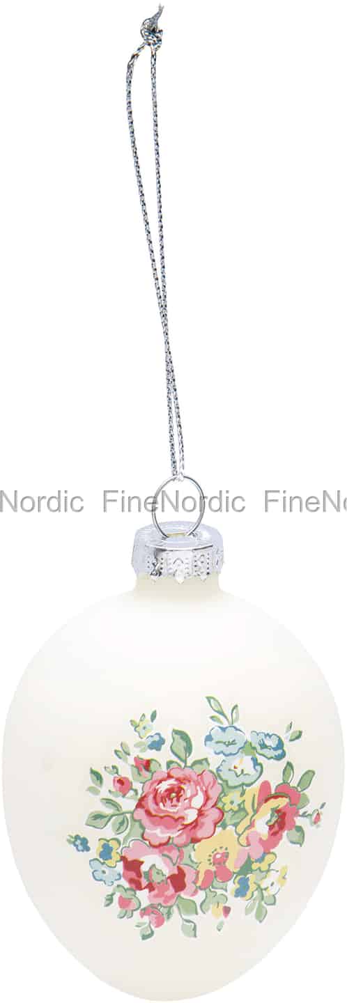 Das Franka Pale Blue Glasei von GreenGate ist mit einem bezaubernden Blumenmuster in Pastellfarben auf weißem Hintergrund verziert. An der Oberseite ist eine Schnur angebracht, mit welches es ganz einfach aufzuhängen geht. Befestigen Sie es an einem Oster- oder Frühlingskranz, ein paar Zweigen oder vielleicht an einem, aus Frühlingsblumen und blühenden Zweigen bestehenden, Osterstrauß. Sie können dieses Glasei auch einfach an einen Knauf oder Griff eines Schranks hängen oder es als zusätzliche Dekoration an ein schön verpacktes Geschenk binden. Das Franka Glasei von GreenGate ist auch in einer grünen und einer blauen Version erhältlich, sodass Sie Ihr Zuhause auch mit allen drei Glaseiern dekorieren können.
