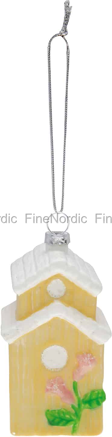 Das pastellgelbe Hausornament von GreenGate besteht aus Glas und hat die Form eines zweistöckigen Vogelhauses. Das pastellgelbe Glashaus hat zwei weiße Dächer und seine Vorderseite ist mit zwei rosa Blumen geschmückt. Das Glasornament hängt an einer Schnur, die es ganz einfach macht, das Ornament an einem Strauß blühender Zweige oder vielleicht an einem Osterkranz zu befestigen. Hängen Sie es alleine auf oder kombinieren Sie es mit dem pastellgrünen und dem pastellrosa Glashaus von GreenGate.