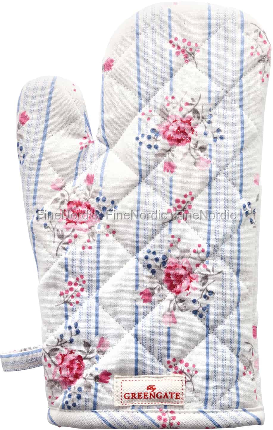 Dieser wunderschöne Grillhandschuh ist auch ein Produkt aus der beliebten Fiona Pale Blue Serie von GreenGate. Er ist mit hellblauen Streifen auf hellem Hintergrund und einem bezaubernden Blumenmuster geschmückt. Wenn er nicht gebraucht wird, dann können Sie ihn ganz einfach an der kleinen aufgenähten Schlaufe anhängen, bis er wieder zum Einsatz kommt. Das bekannte GreenGate Label ist auch aufgenäht, sodass erst gar kein Zweifel aufkommen kann, in welchem Hause der hübsche Grillhandschuh wohl kreiert wurde. Er besteht aus 100% Baumwolle und kann bei 40 ° C gewaschen werden. Verwenden Sie ihn zum Grillen, Backen und Kochen und Ihre Finger werden immer gut geschützt sein. Wir haben eine große Auswahl an GreenGate Grillhandschuhen in unserem Webshop anzubieten.
