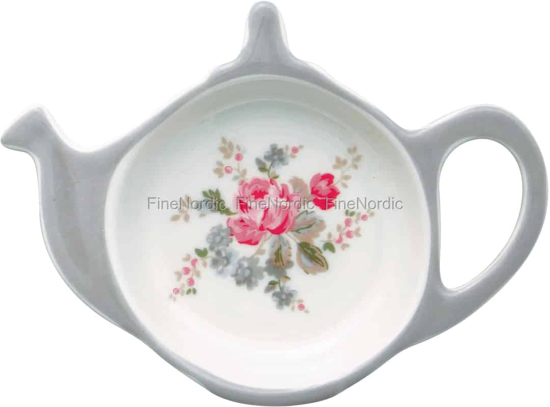 GreenGates Teebeutelhalter Elouise White sieht nicht nur hübsch aus auf dem Tisch, sondern ist dazu auch sehr praktisch. Wenn Ihr Tee fertig mit Ziehen ist, können Sie den Teebeutel einfach auf diesen Halter legen und Ihre Teekränzchen ohne Unterbrechung fortsetzen. Der Teebeutel Untersetzer hat die Form einer Teekanne, geschmückt mit einem Blumenstrauß in der Mitte und einem grauen Rahmen. Sie können ihn gut mit dem anderen Elouise White Porzellan kombinieren und er kann auch mit anderen GreenGate Serien, wie z.B. Alice Stone Grey, gemischt werden. Schauen Sie sich gerne mal die Auswahl an charmanten GreenGate Teebeutelhalter an, die wir zur Verfügung haben.
