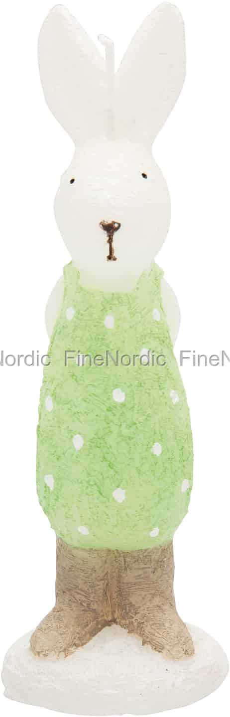 Die entzückende Kaninchenkerze von GreenGate sieht so gut aus, dass sie fast schon zu schade zum Anzünden ist. Das Wachskaninchen steht ganz kerzengerade und es trägt ein grünes Outfit, das mit fröhlichen weißen Punkten verziert ist. Die langen Hasenohren sind nach oben gerichtet und dazwischen ist der Kerzendocht zu sehen. Die Kerze ist eine hübsche Dekoration für die Fensterbank oder das Regal und Sie können sie mit der hellrosa oder hellblauen Kaninchenkerze kombinieren, oder vielleicht auch einfach gleich alle drei nebeneinander stellen? So werden sie auf jeden Fall zum Blickfang im Raum. Wenn Sie sie nicht anzünden, können Sie sie in den folgenden Jahren immer wieder als Frühlingsdeko verwenden.
